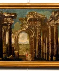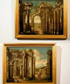 Coppia di capricci architettonici fantastici con rovine classiche e figure , Scuola romana fine XVII – inizi XVIII secolo – Seguace di Niccolò Codazzi (Napoli, 1642 – Genova, 1693)