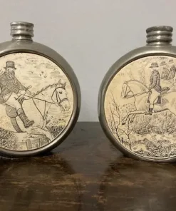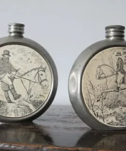 Coppia di antichi porta liquori inglesi XIX sec in argento Sheffield e disegni incisi