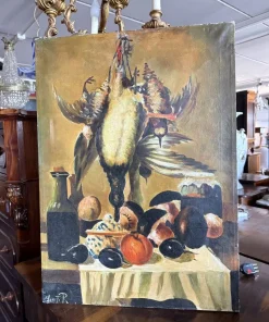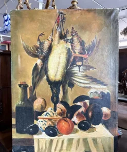 Olio su tela raffigurante natura morta e cacciagione XX sec., firmato