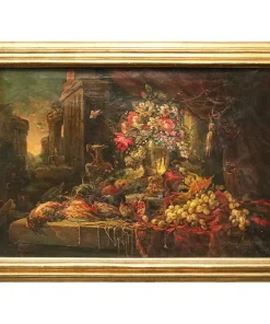 G. Zampogna, Natura morta di fiori e frutti, 1952, Olio su tela, con cornice