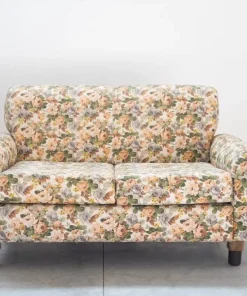Divano 2 posti, tessuto floreale, struttura in legno, piedini in plastica e legno, 1970