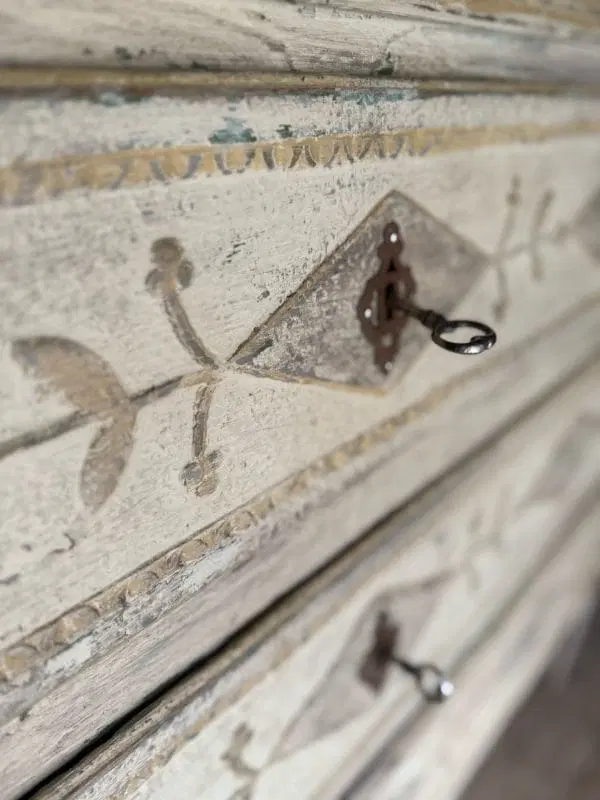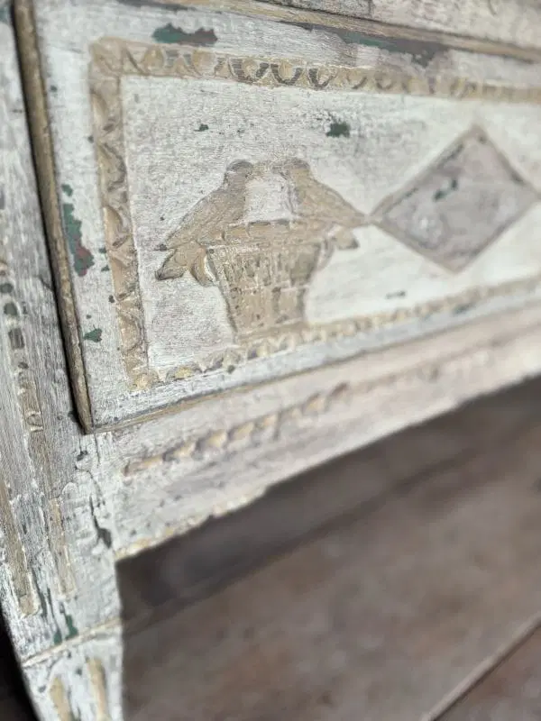Magnifique commode liégeoise patinée et à décor sculpté d’oiseaux Louis XVI datant du 19ème siècle Ouvrant à 3 tiroirs avec clés en parfait état, très belle patine riche en plusieurs couleurs