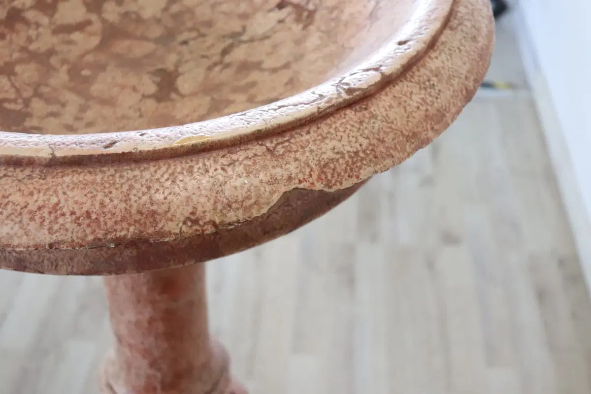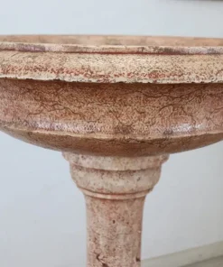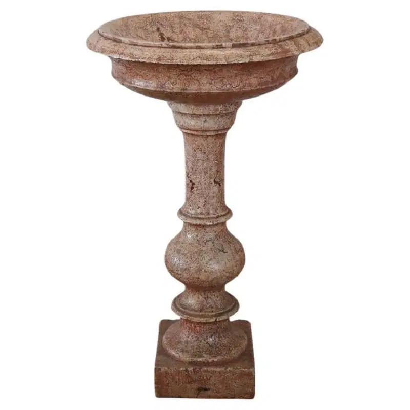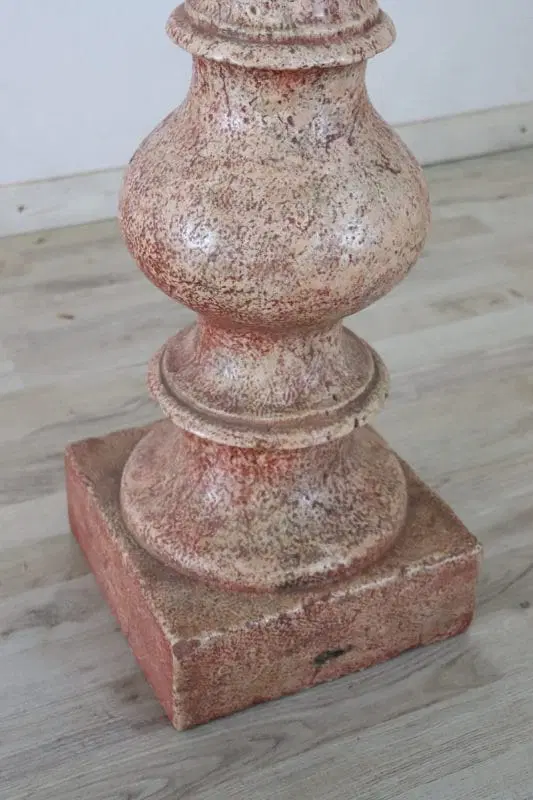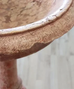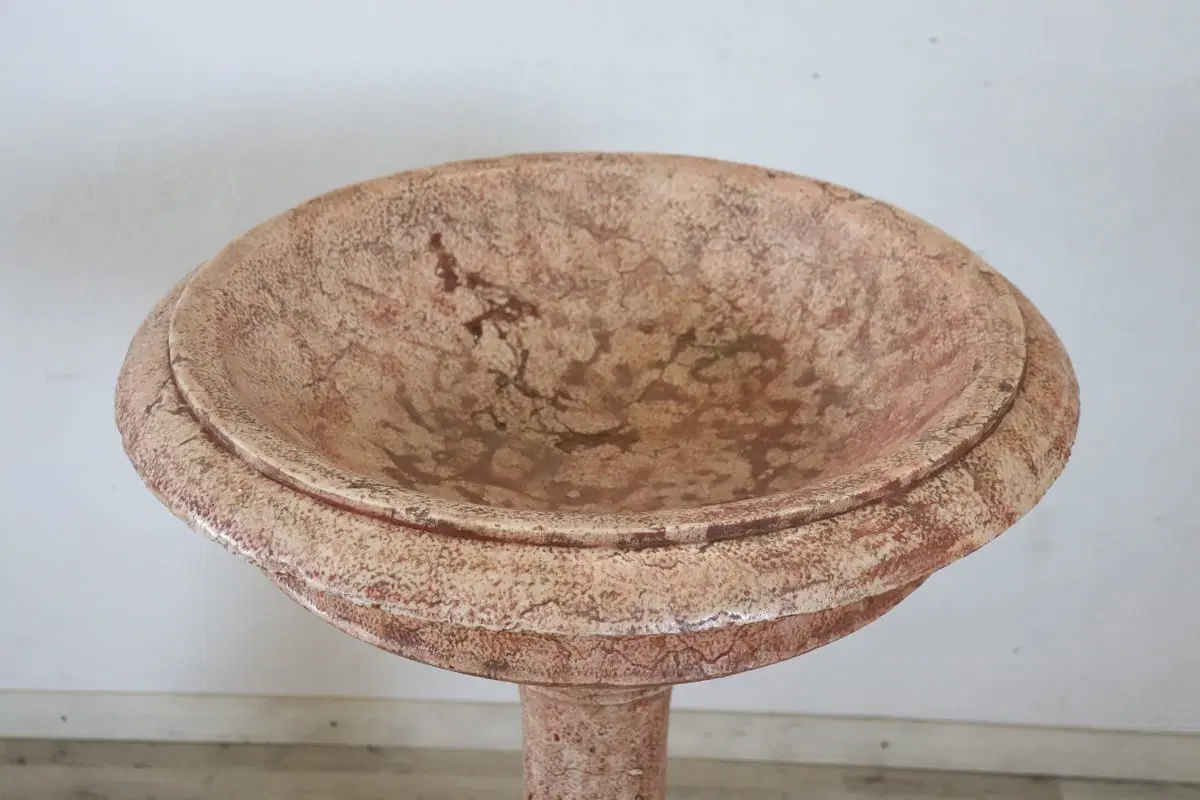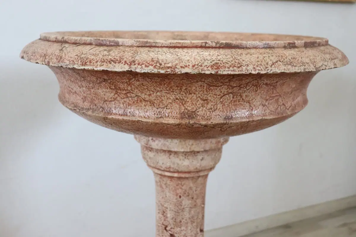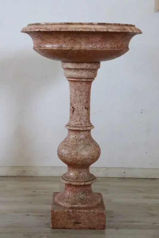 Rara acquasantiera italiana antica in pietra scolpita databile intorno agli inizi del secolo XX. Il suo stile è classico con una vasca circolare a bordo modanato sostenuta da una balaustra tornita a più ordini e da un piede quadrato. la pietra è stata smaltata di colore rosso per dare un effetto marmoreo. Segni dovuti all’usura e al passare del tempo. Questa acquasantiera è ideale per essere utilizzata come elemento decorativo sia in interno che in esterno. Proposta ad un’ottimo prezzo trattabile vi invitiamo ad inviarci le vostre proposte di acquisto le valuteremo con piacere.