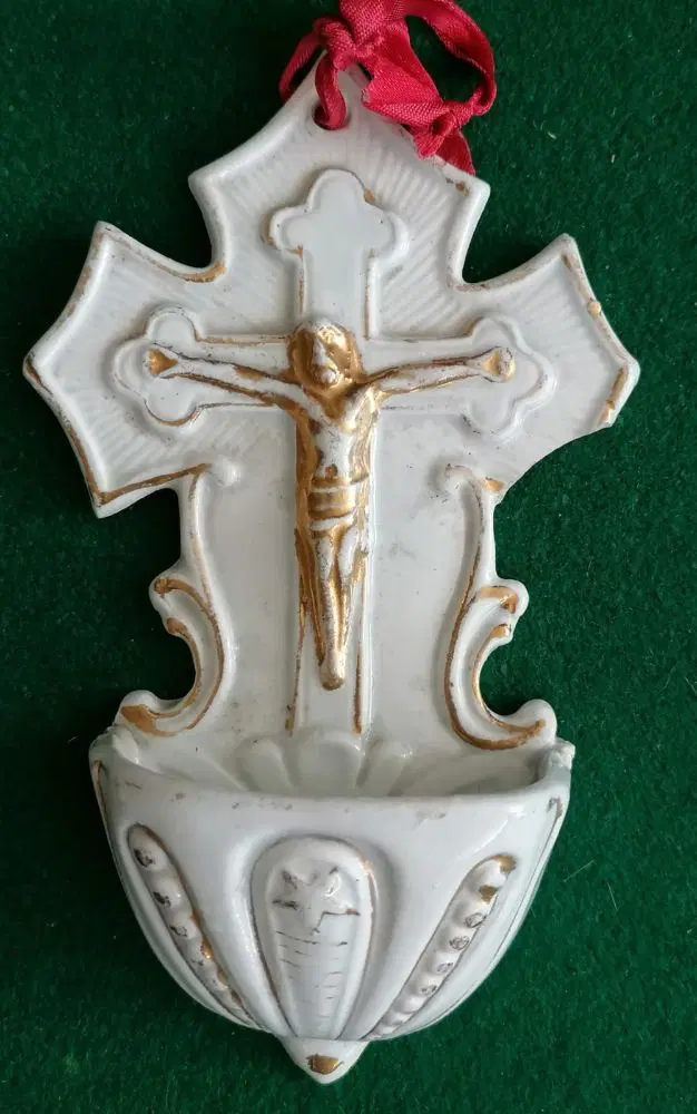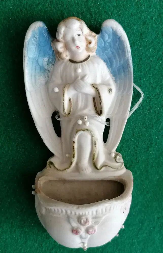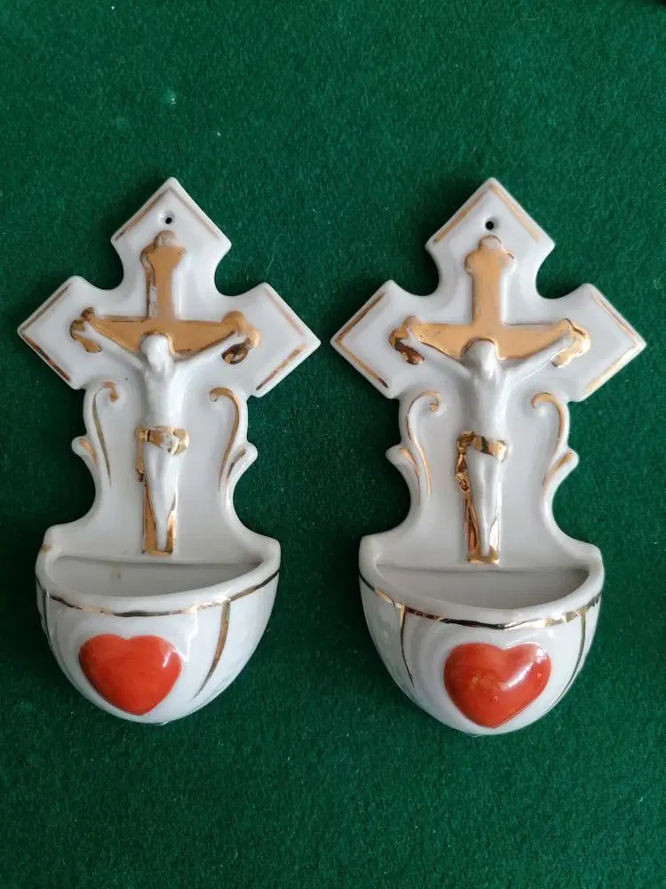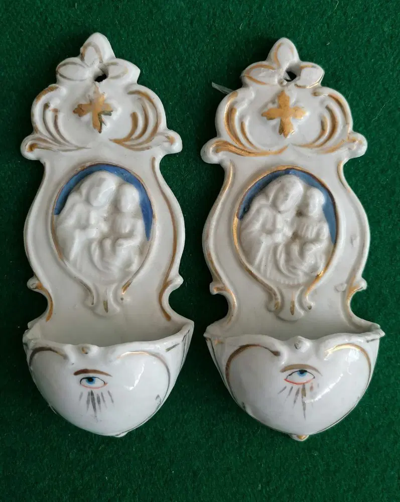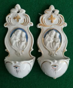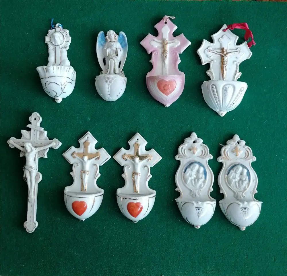 Collezione di 9 acquasantiere in ceramica, di cui due coppie e cinque singole in buone condizioni. Di varia provenienza europea e manifatture diverse. Alcune piccole mancanze per scheggiature o difetti della ceramica. Misure comprese tra 12 e 19 cm.