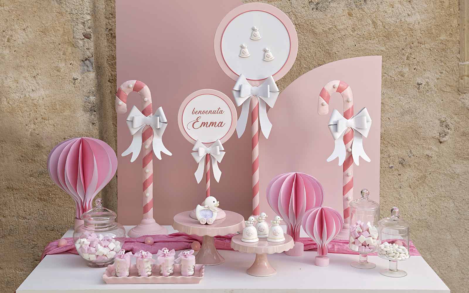 Il tema più in voga per gli eventi della prossima stagione sarà il mood Candy Stick che ritroviamo negli elementi scenografici: bastoni dotati di luci led, display in metallo coordinati per appendere dei magneti abbinati, fino ai chiudipacco in resina per decorare le bomboniere.