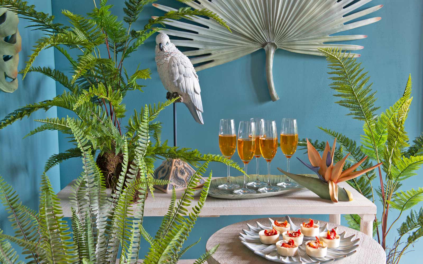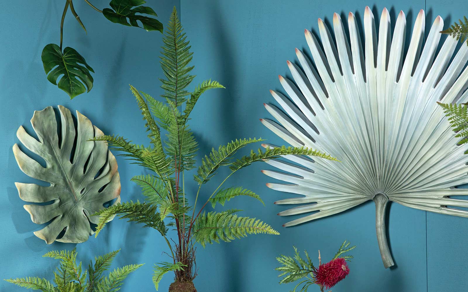 Una collezione di oggetti decor che ci fa respirare già aria di vacanza, grazie ad una vegetazione lussureggiante, animali esotici e motivi tropicali. Le maxi foglie in resina di Filodendro e Chamaerops da appendere alle pareti, creano in pochi passaggi una suggestione da foresta tropicale. Protagonisti della scena cacatua e macao dai piumaggi preziosi e colori brillanti, sono dei ricercati elementi decorativi con un grande impatto visivo, per arredare e allestire corner o grandi spazi. Il risultato? Un’ ambiente dal look naturale, ma con una connotazione fresca e contemporanea, merito di una nuovissima combinazione cromatica di blu petrolio e verde salvia.