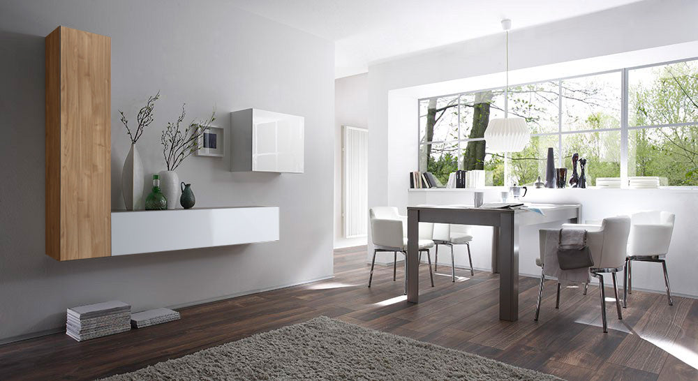 Parete moderna Afrodite, formata da 3 elementi, ovvero un pensile orizzontale, uno verticale e un pensile cubo, nei colori bianco lucido e noce stelvio.