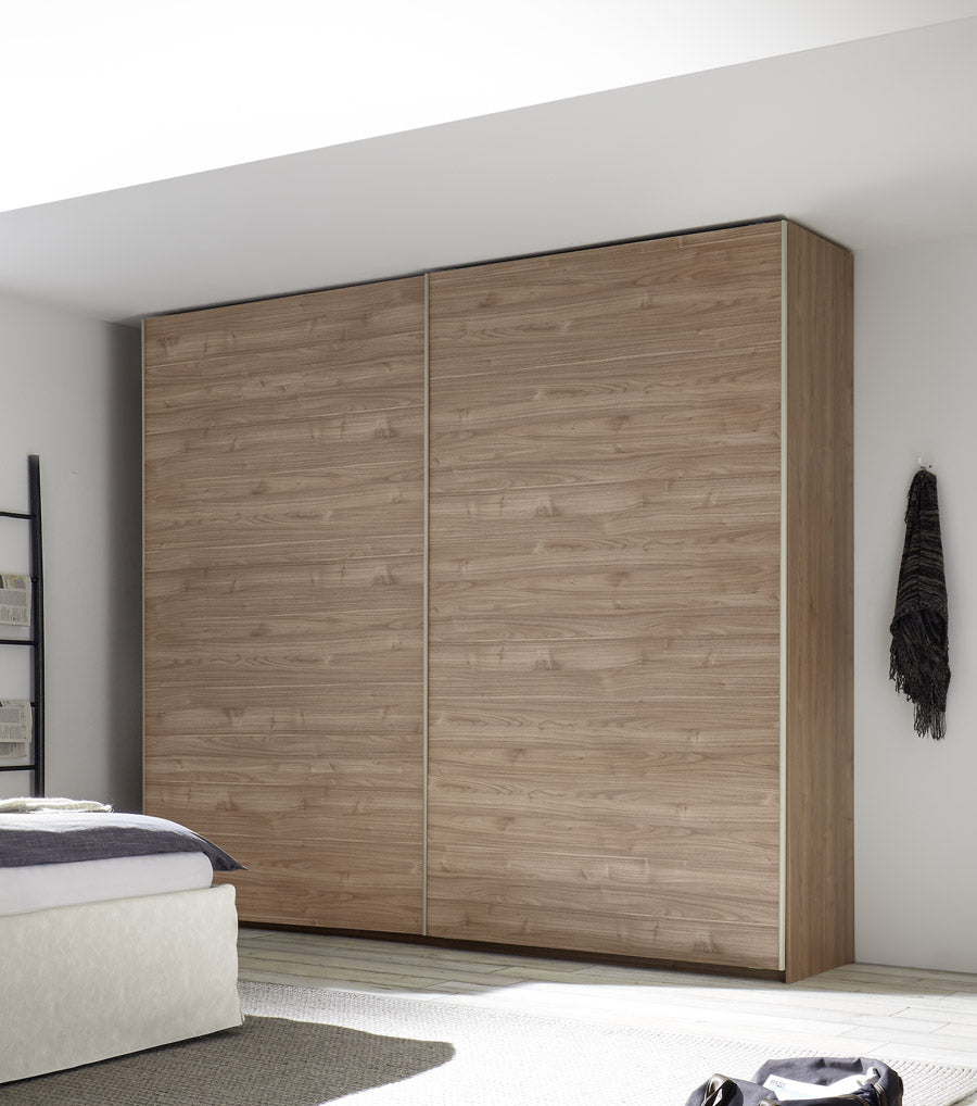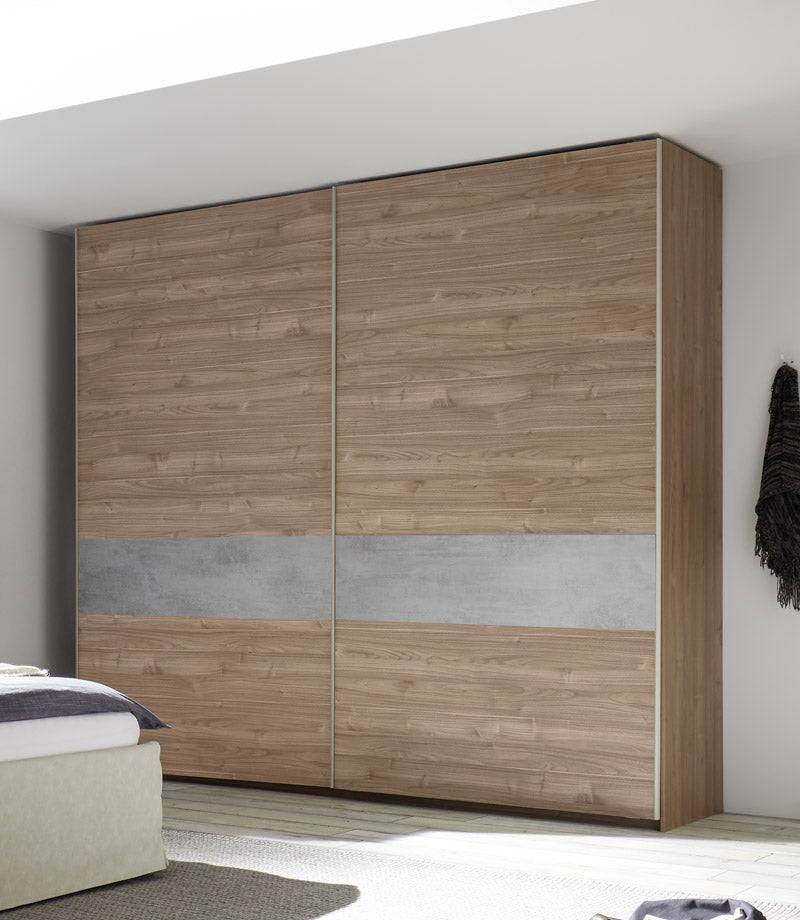 Armadio design Aganel con 2 ante scorrevoli da cm 220x218h realizzato in legno in una classica finitura noce stelvio, disponibile in due versioni: interamente noce oppure con inserto centrale colore cemento. Funzionale e resistente, Aganel è esempio di Made in Italy progettato con cura per ogni aspetto estetico e funzionale.