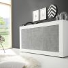 La credenza è fruibile in diverse varianti con abbinamenti per ogni esigenza, alternando superfici lucide con struttura opaca e cassetti di colore differente, tra bianco, pero e cemento
