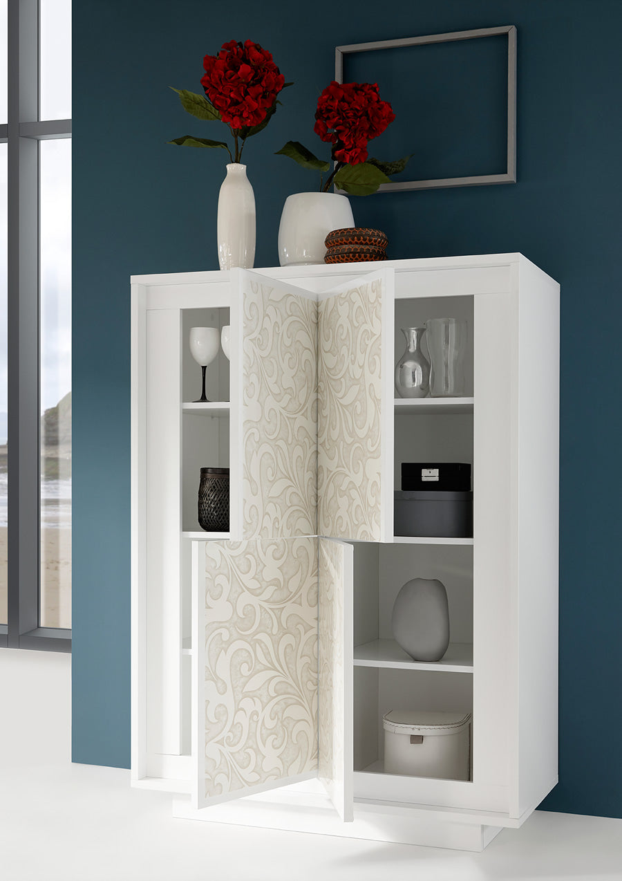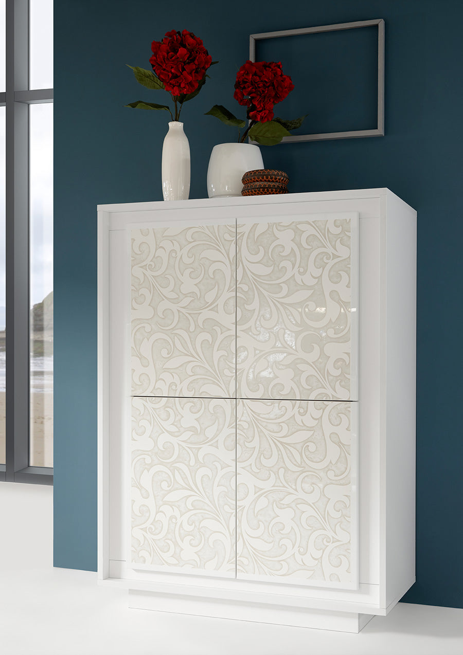 Aitana – Credenza moderna alta 4 ante bianco opaco serigrafia floreale cm 106x50x146h