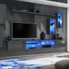 Parete da soggiorno Alcanet, composta da 9 pensili sospesi: 2 base porta tv, mensola e 6 cubi, 3 semplici e 3 con vetrina, combinati insieme. Scegli tra le tante proposte, tutte bicolore con bianco, nero, antracite alternando anche componenti in quercia natura.