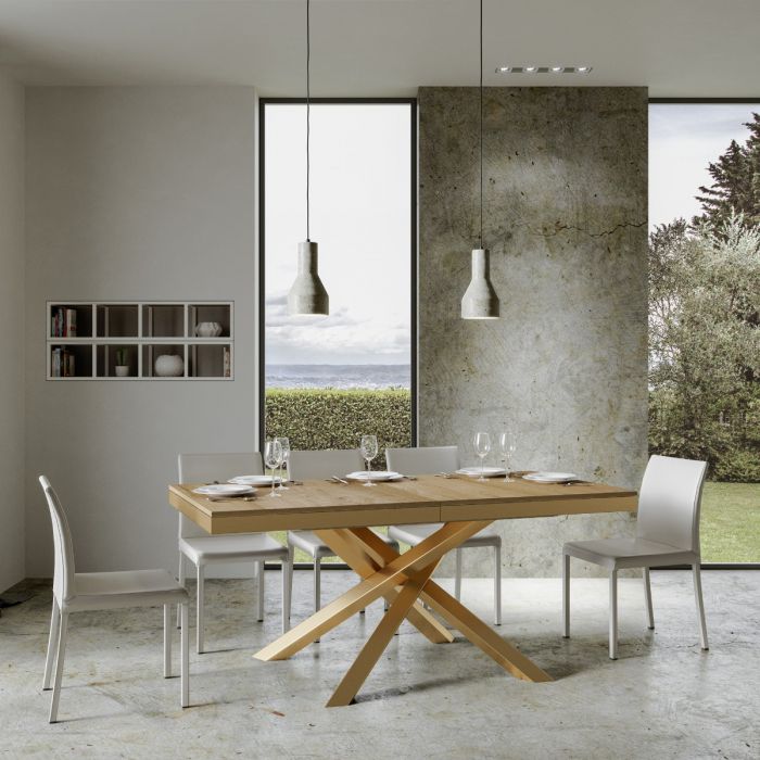 Incantevole tavolo design allungabile Algeri Evolution in questa versione con gambe incrociate in metallo colore oro. Algeri Evolution è disponibile in diverse misure e allungabile con 2 o 5 allunghe. Inoltre, potrai scegliere anche la finitura del piano, preferendo finitura classiche come noce, bianco frassino, quercia natura oppure una particolare finitura cemento o l’elegante effetto marmo.