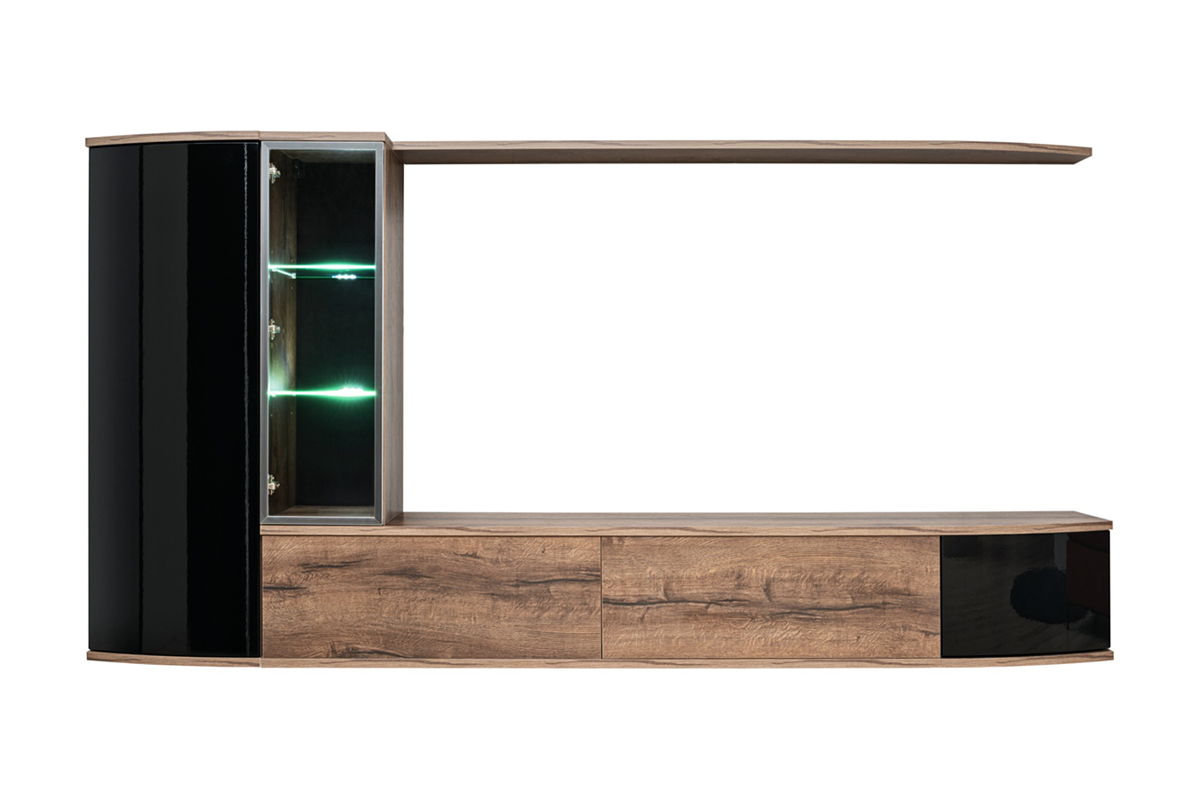 Raffinatissima parete attrezzata moderna realizzata dalla fusione di 2 colori estremamente attuali: nero lucido e rovere scuro. Il mobile sospeso per la zona living è caratterizzato dalla presenza di un mobile tv, pensile alto, vetrina con led e mensola. Capiente, elegante e perfetta per ogni ambiente.