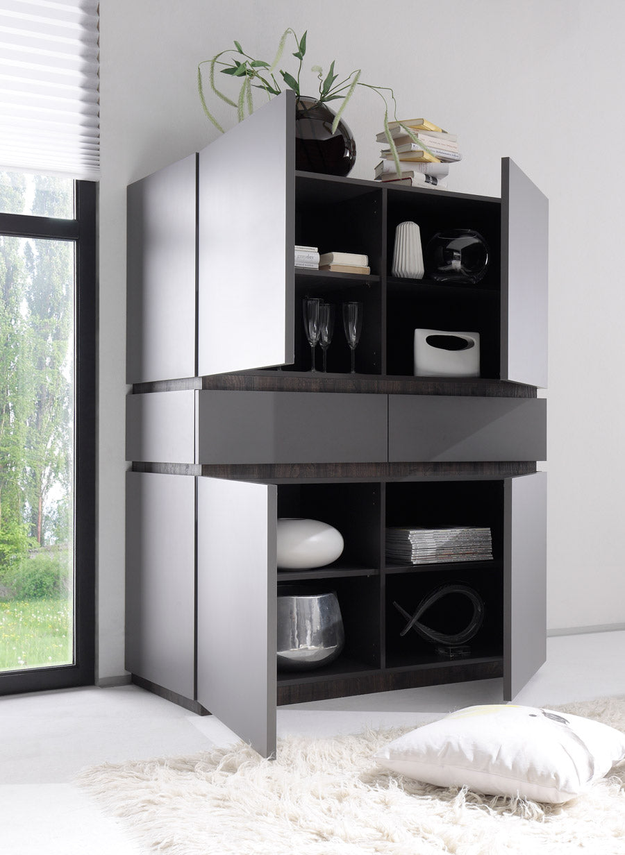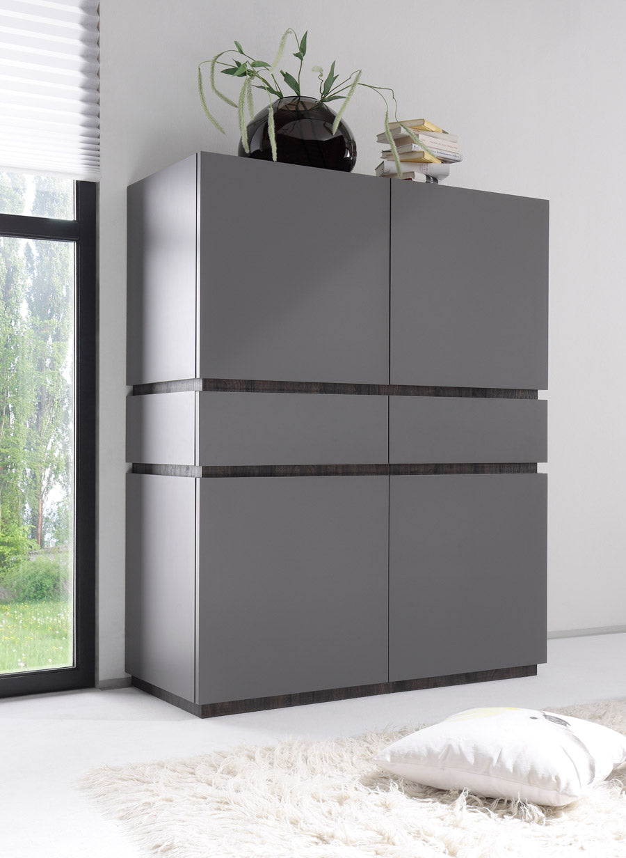 Amanda è una bellissima credenza alta, facente parte di una linea di mobili living dal design minimal per realizzare ambienti dallo stile unico ed elegante. Il buffet Amanda si compone di 4 ante e 2 cassetti centrali, tutto realizzato in legno grigio opaco distinto solo da graziosi inserti che contrastano con la linearità della struttura, questi potranno essere realizzati in grigio oppure in rovere wengè.