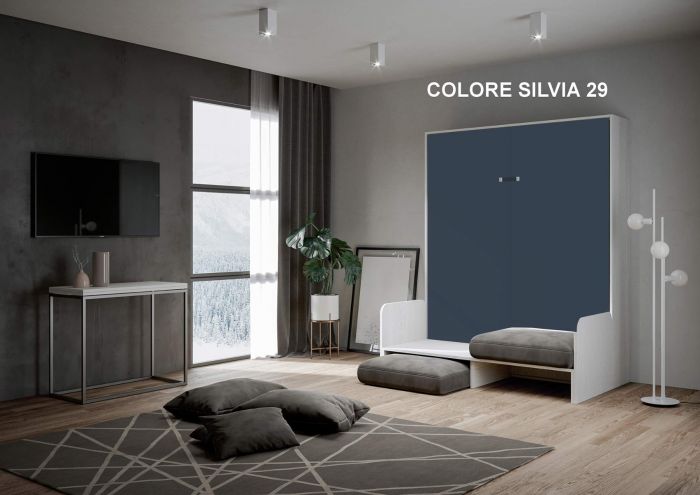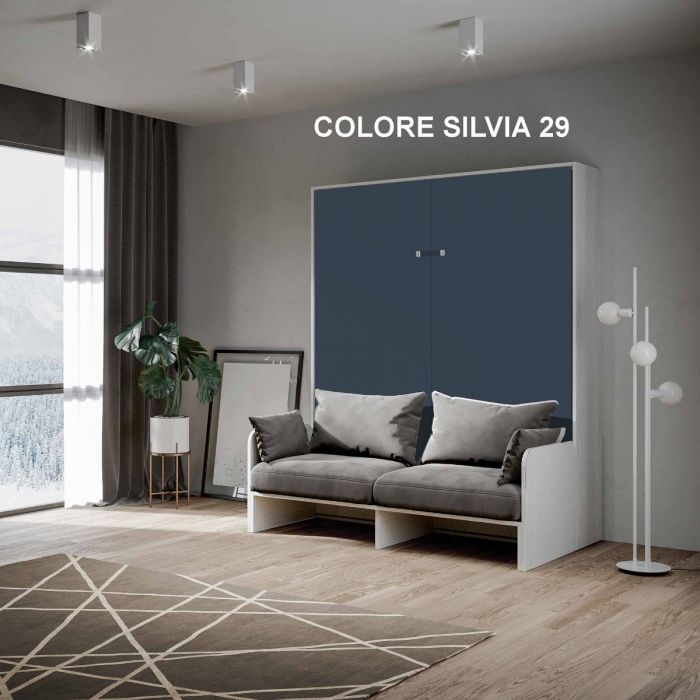 Il letto a scomparsa Anacleto Color si arricchisce anche di un comodo divano facente parte di un’unica struttura in legno che potrai scegliere tra bianco frassino o noce.