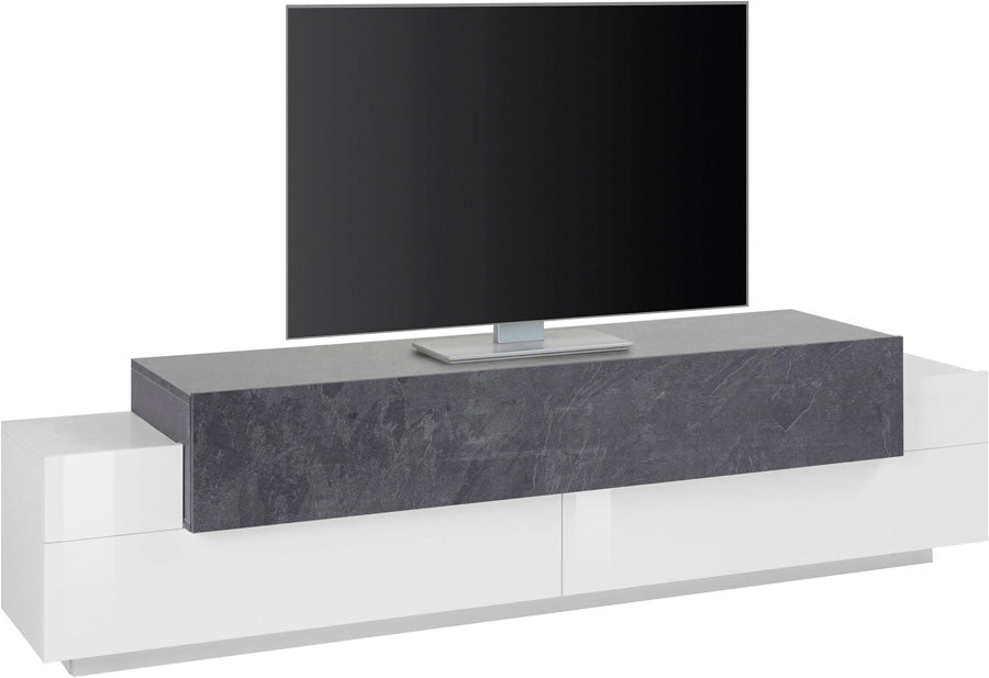 Fantastico mobile porta tv realizzato in legno, colore bianco lucido, con la particolare distinzione di colore dell’anta a ribalta, la quale è disponibile nella colorazione ossido o pero. La struttura del mobile, inoltre, è dotata di altre 2 ante, dal design moderno e originale. Perfetto da collocare in soggiorno o salotto, questo porta tv è il complemento ideale, per chi ama un look unico e grazioso per la sua casa.