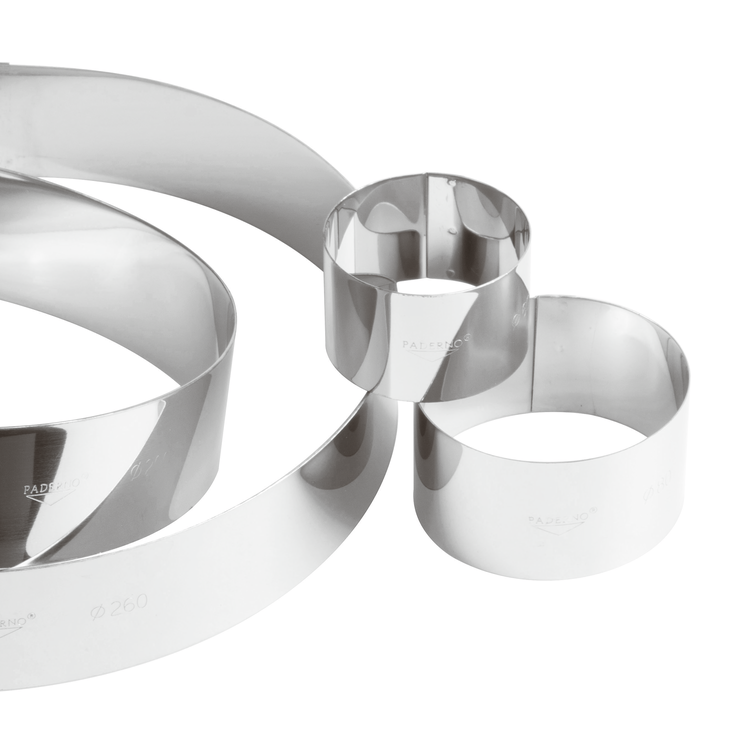 L’anello per mousse in acciaio inossidabile della linea Accessori Cucina e Pasticceria Paderno è l’accessorio ideale per creare dolci monoporzione impeccabili e raffinati. Con un diametro di 12 cm e un’altezza di 4,5 cm, è perfetto per mousse, torte morbide e semifreddi.