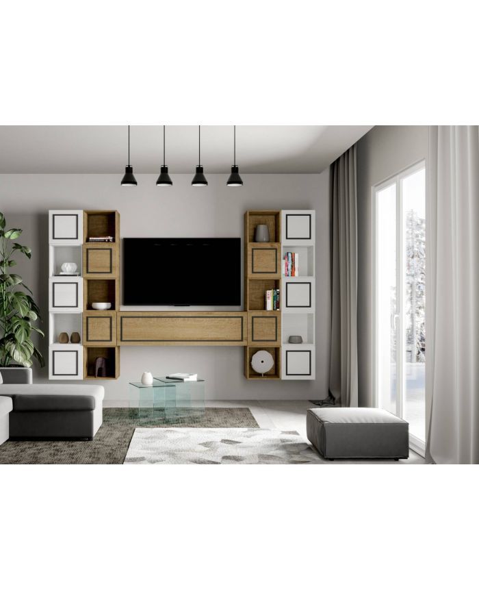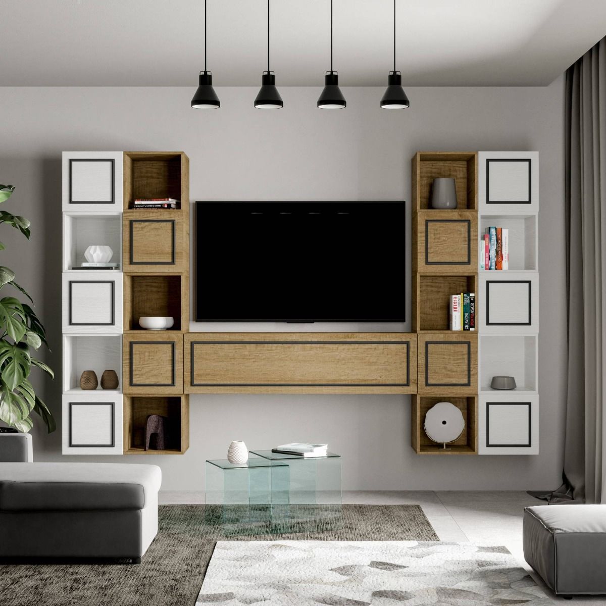 Annalisa Evo – Parete soggiorno moderna in legno con vani e cubi colore quercia