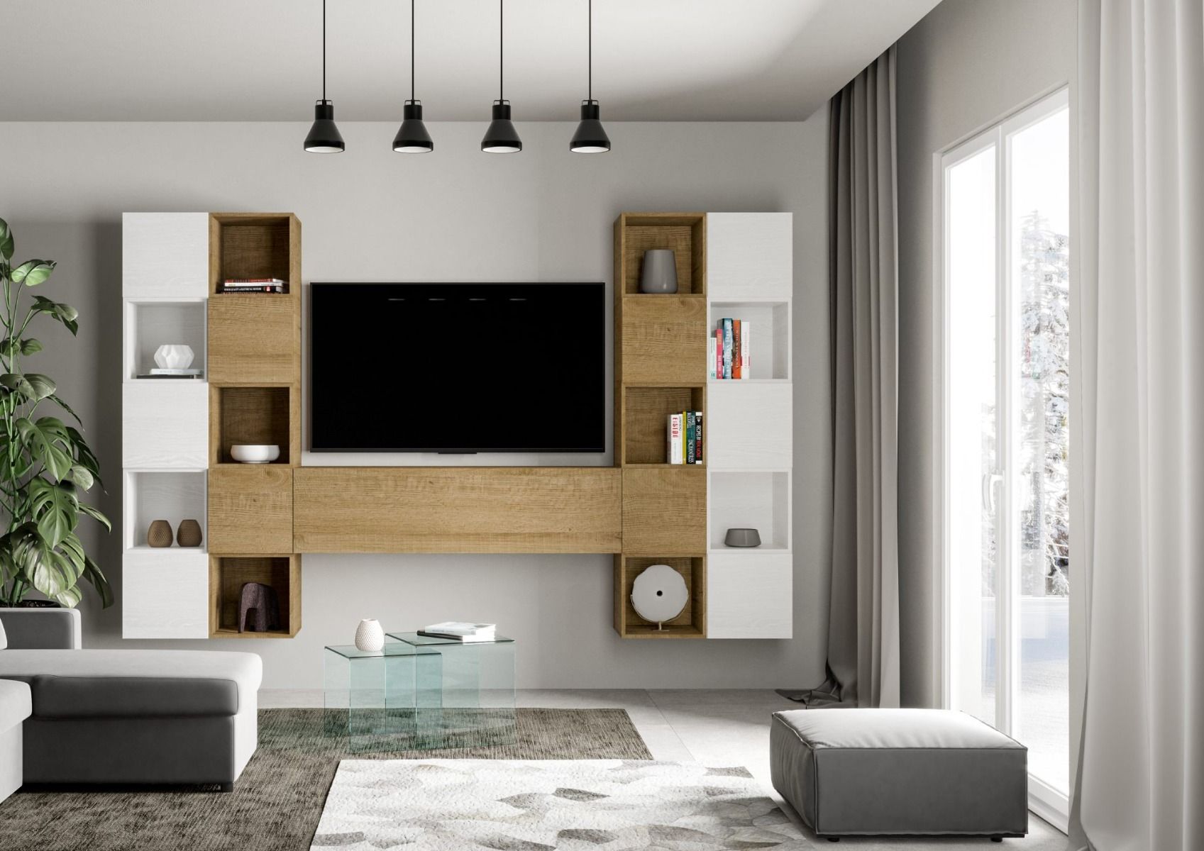 Parete attrezzata per soggiorno Annalisa, definita da una struttura interessante con un gioco di alternanza vuoto e pieno, reso possibile dai numerosi cubi chiusi e vani a giorno che la compongono. Inoltre, la parete modera Annalisa dispone di un pensile orizzontale che funge da base tv e che offre ulteriore spazio grazie ai vani interni. Annalisa è un prodotto completamente italiano, ideato e realizzato da professionisti del settore.