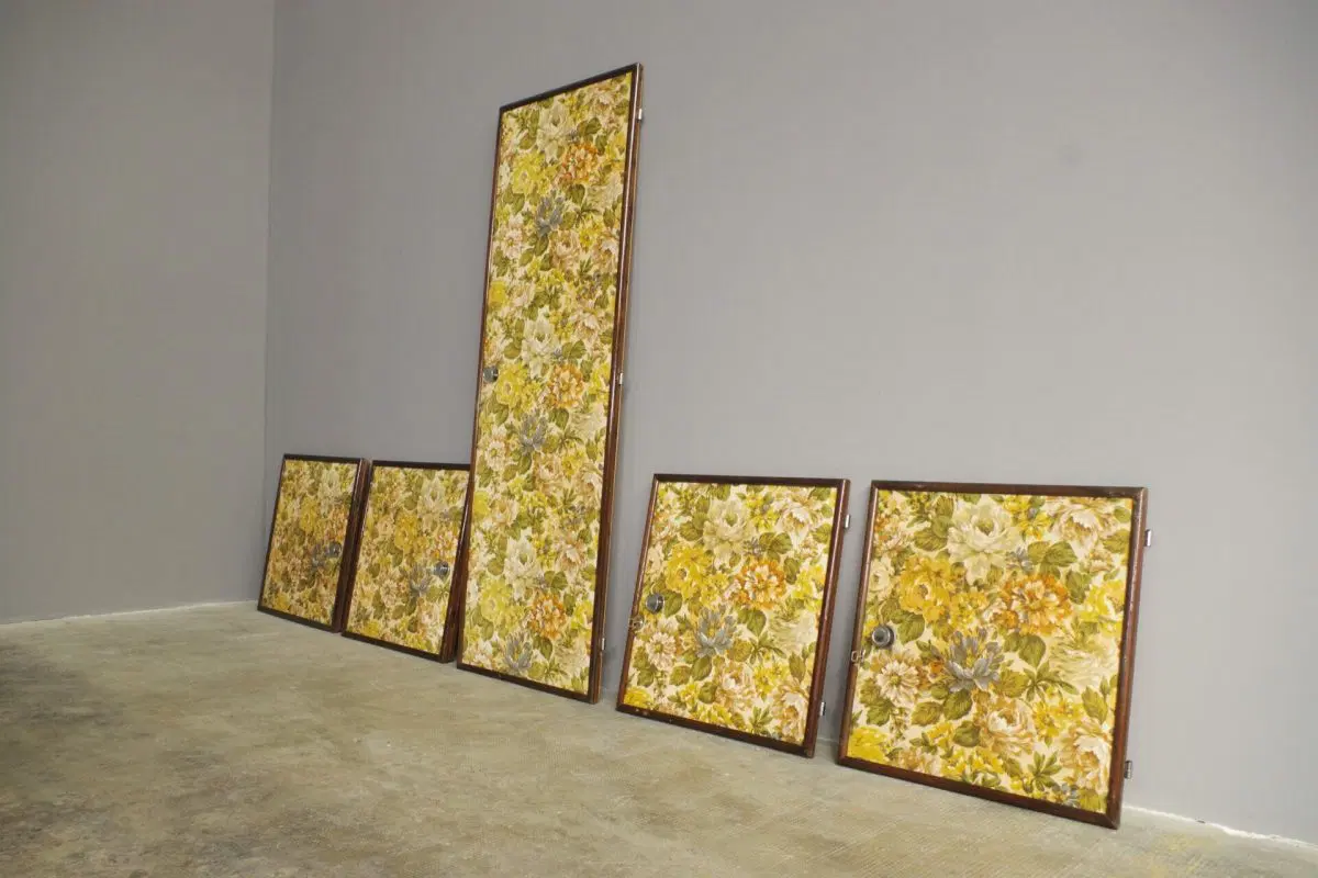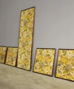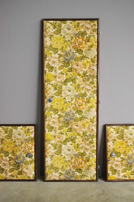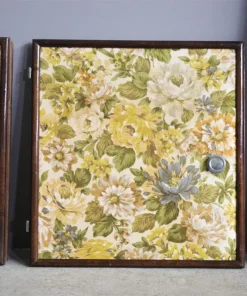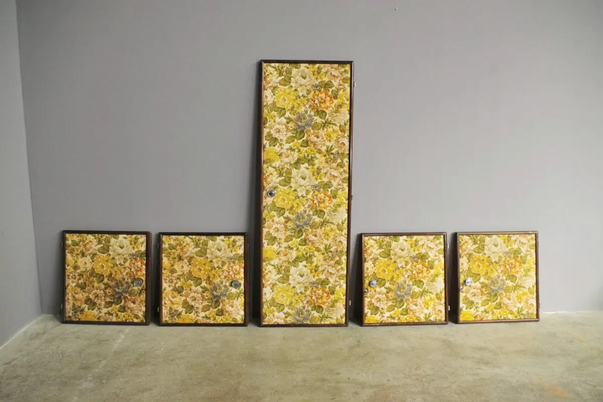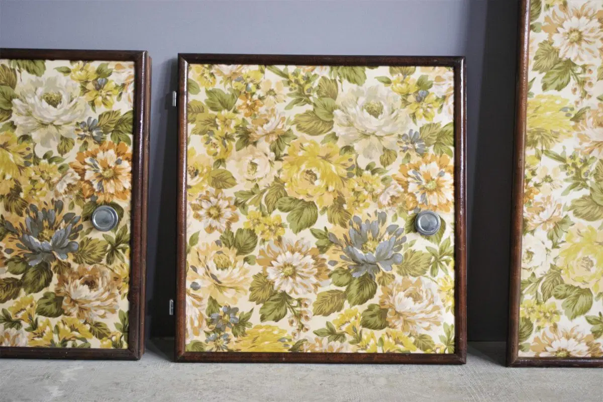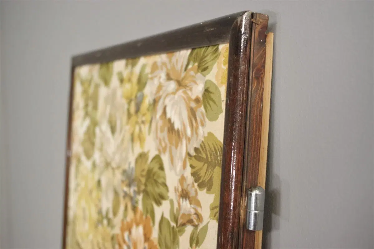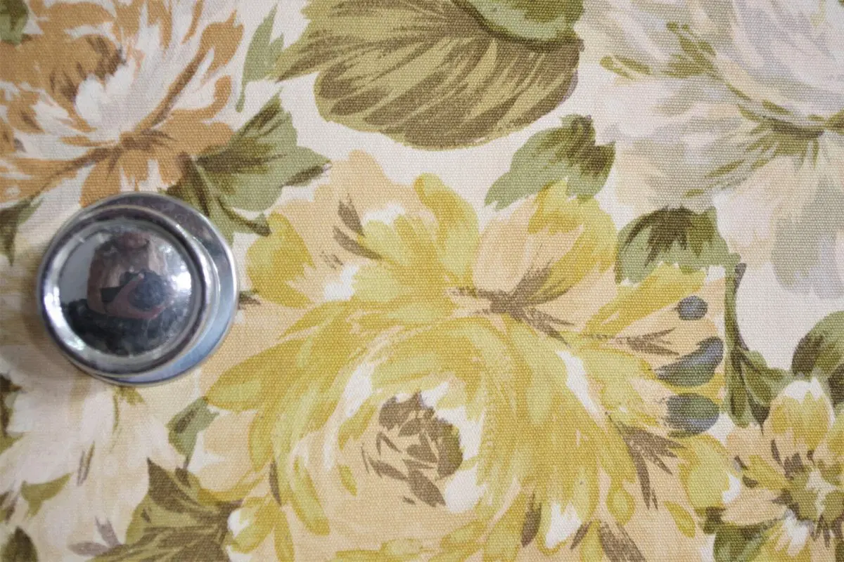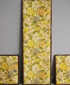 Ante imbottite, tessuto floreale con pomolo in ferro e chiave, legno multistrato di faggio, anni ’50