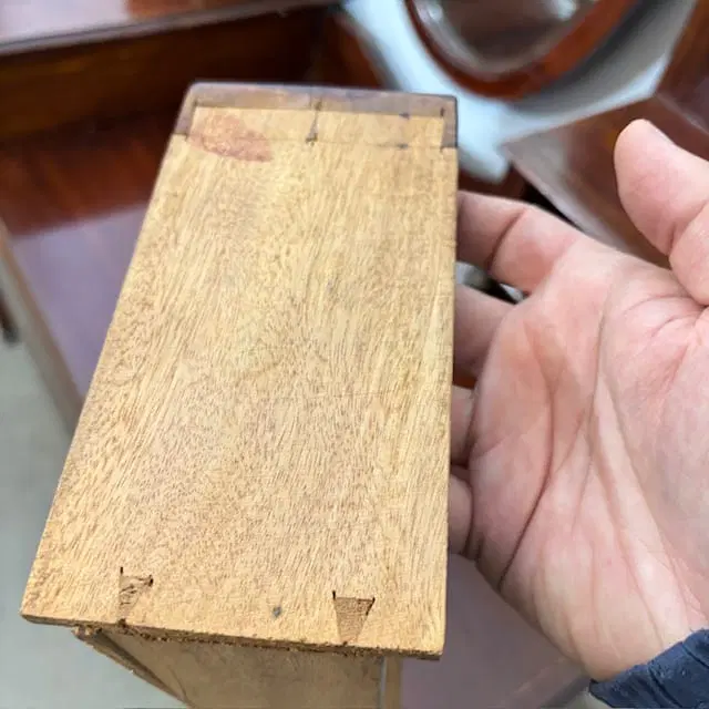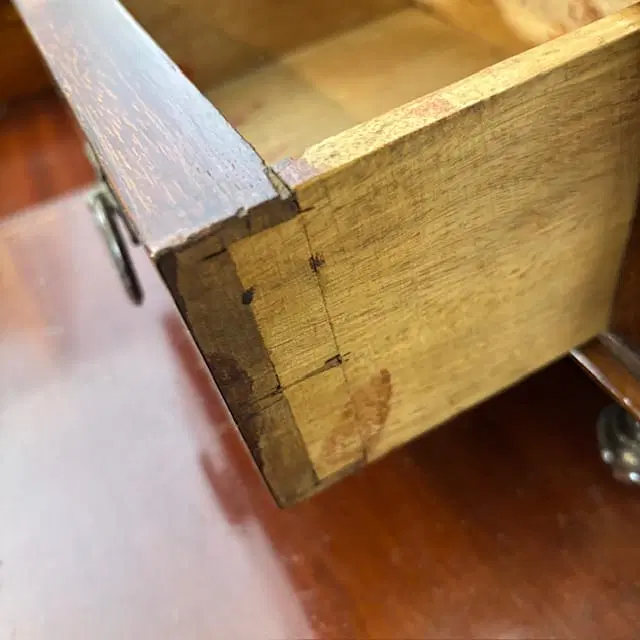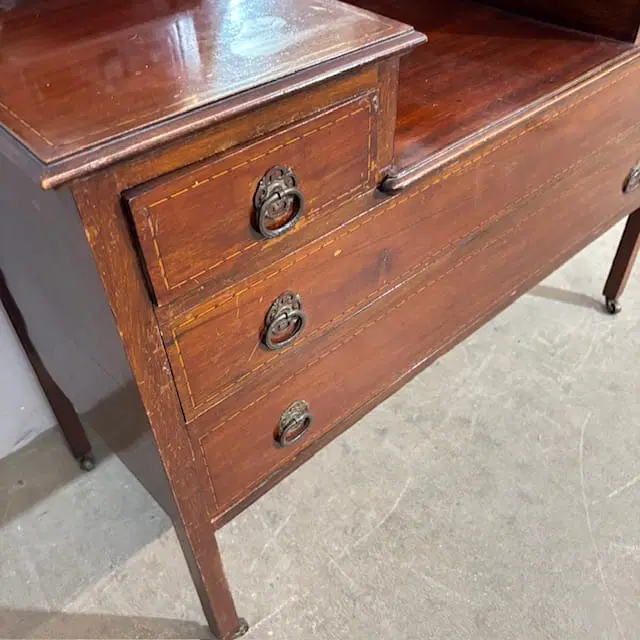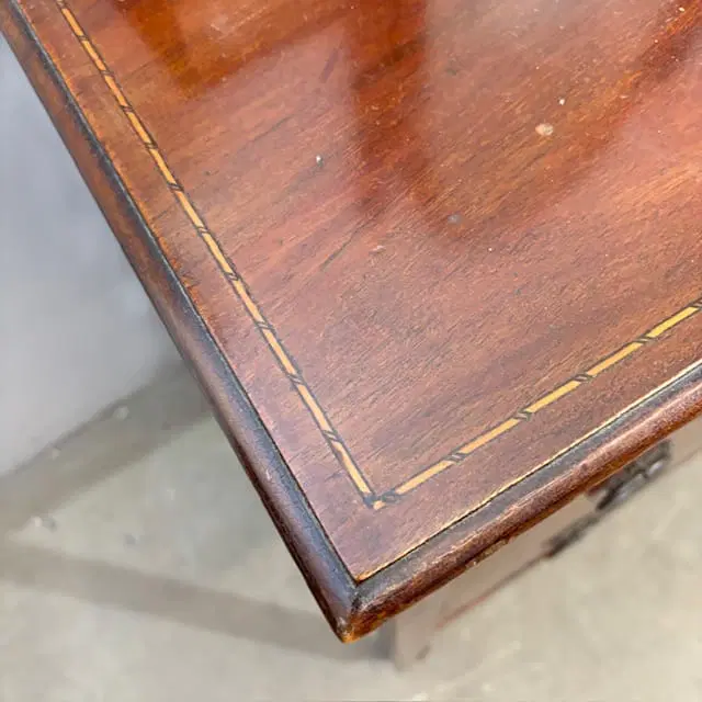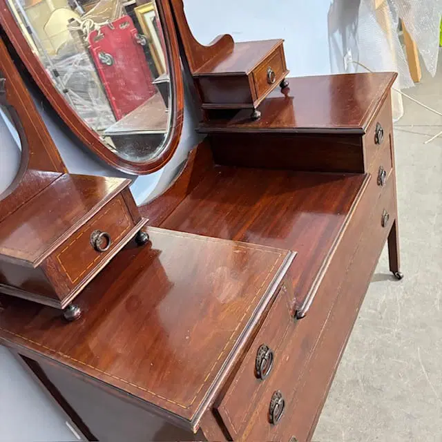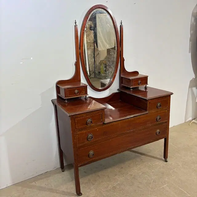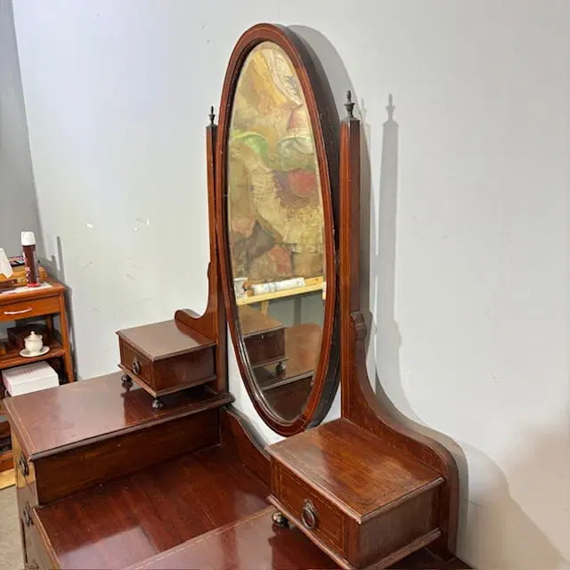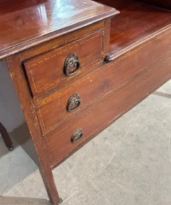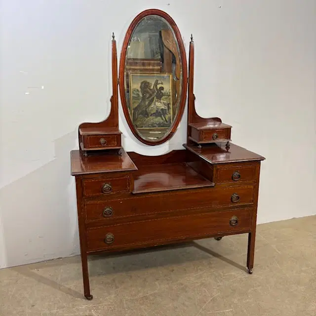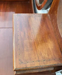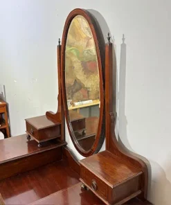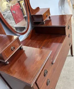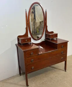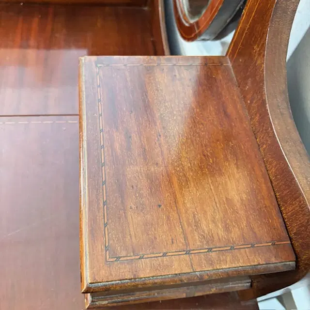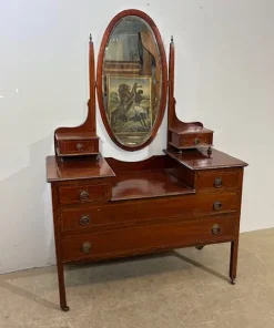 Antica cassettiera toilette inglese mogano e intarsi XIX sec . Specchio Basculante. Quattro cassetti piccoli e due grandi , buono stato non restaurato presenti segni del tempo. Gambe con rotelle antiche . Mis 68 x 45 . h 142. Altezza base cm 79