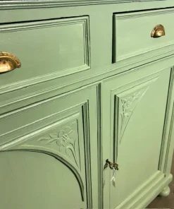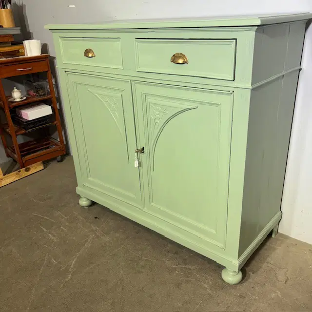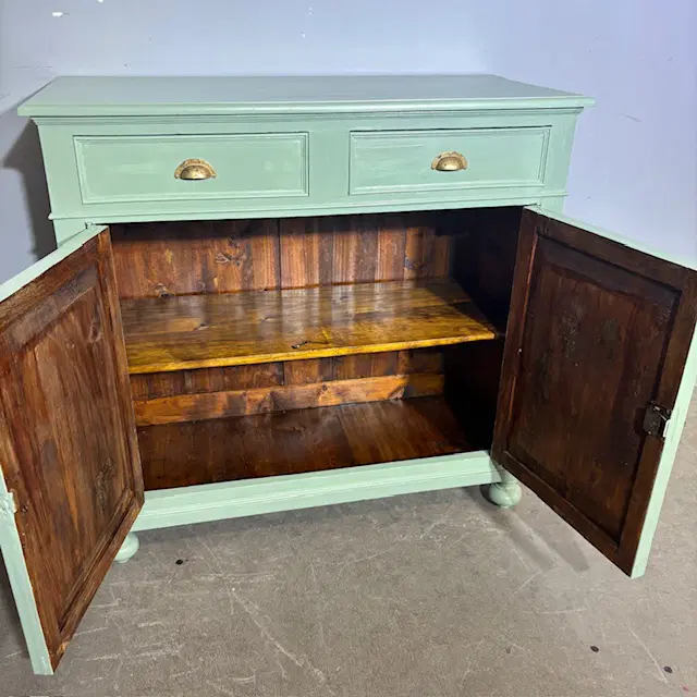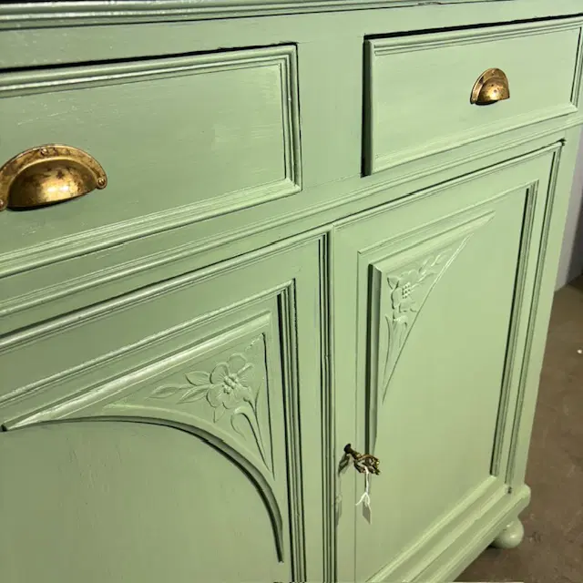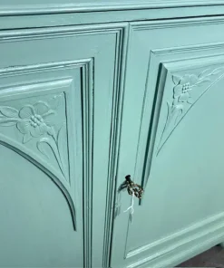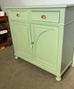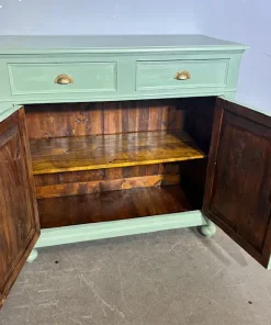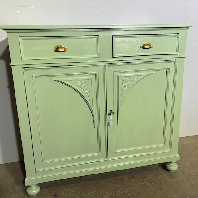 Antica credenza Liberty primi 900 , doppio cassetto sotto il piano , parte inferiore a doppia anta con ripiano interno . Restaurata totalmente , laccata verde Provenza. Mis 107 x 47 . h 103. Molto carini gli intagli floreali tipici del periodo Liberty. Pronta da inserire in ambiente.