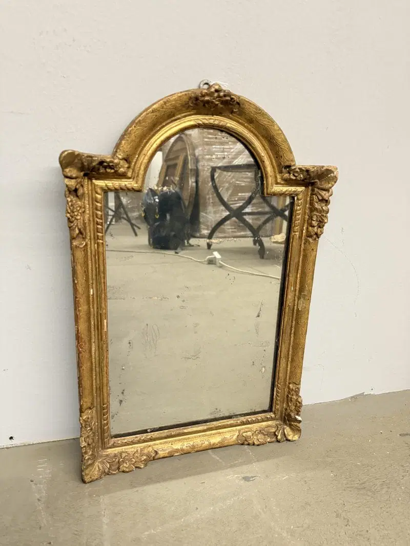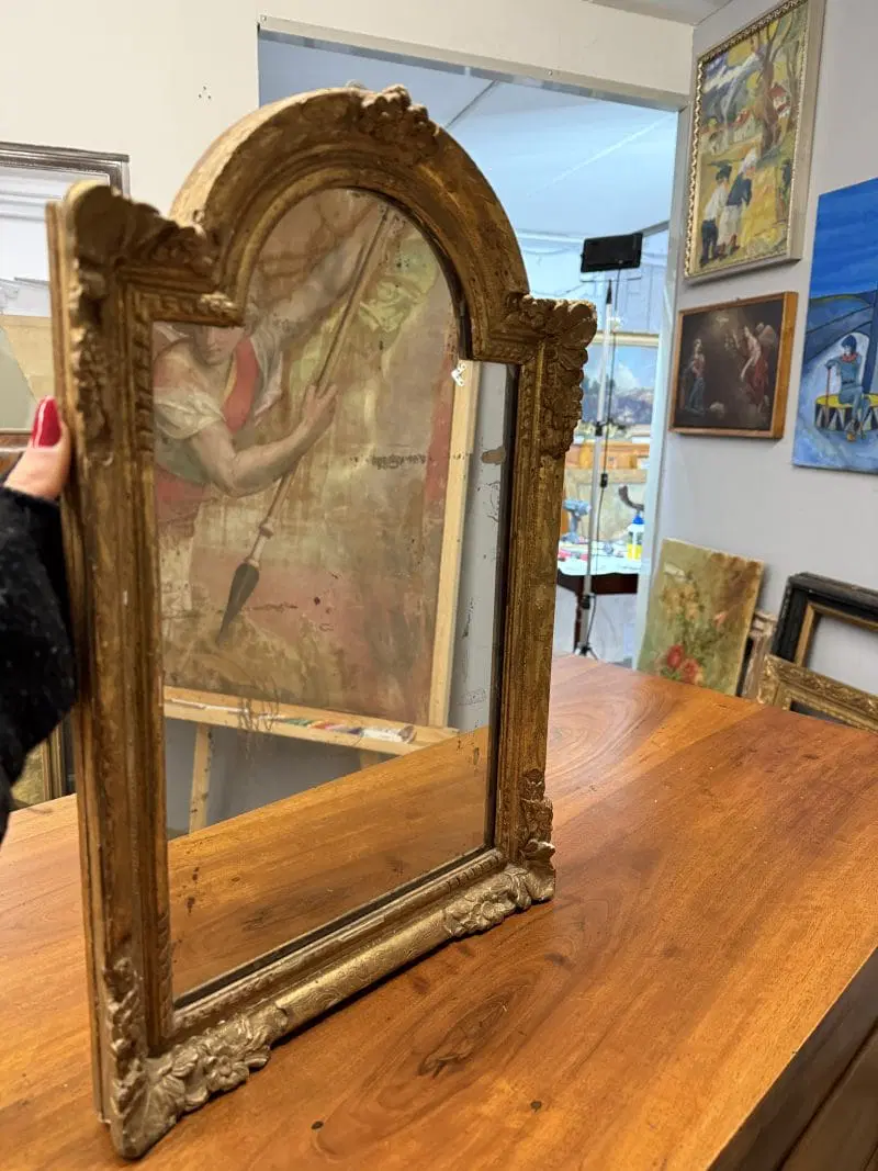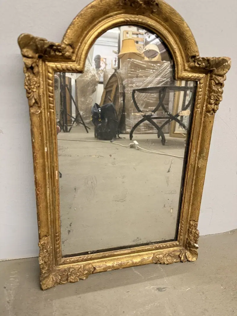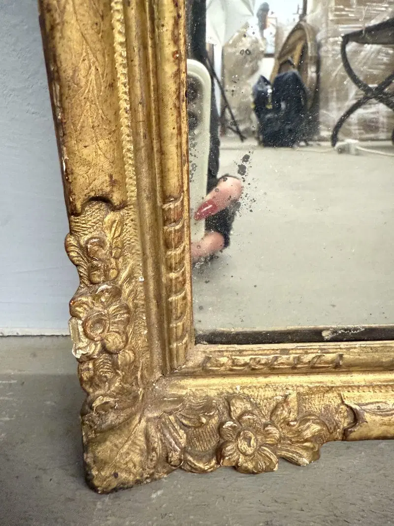 Antica piccola specchiera L. Filippo XIX sec., dorata foglia oro. mis 52x 34 cm. Piccoli difetti o mancanze, buono lo stato generale. Specchio coevo