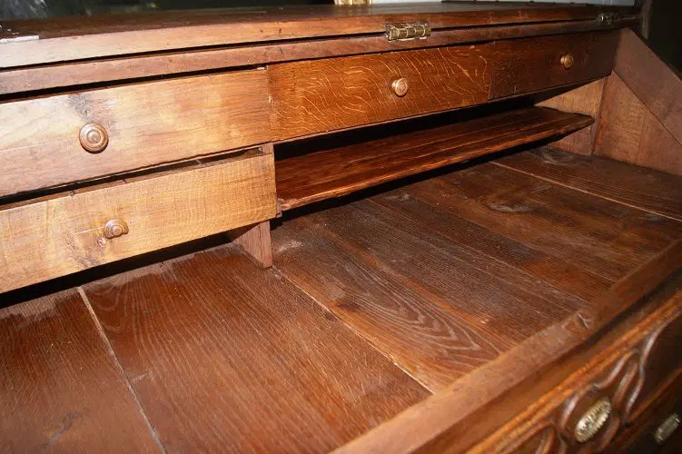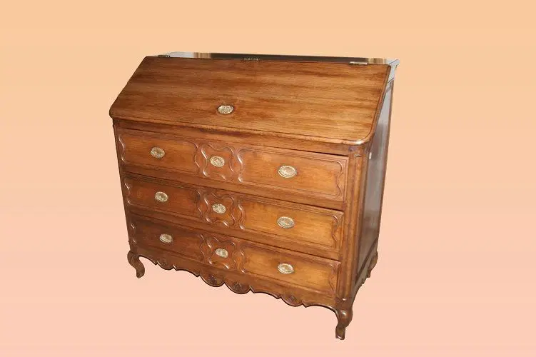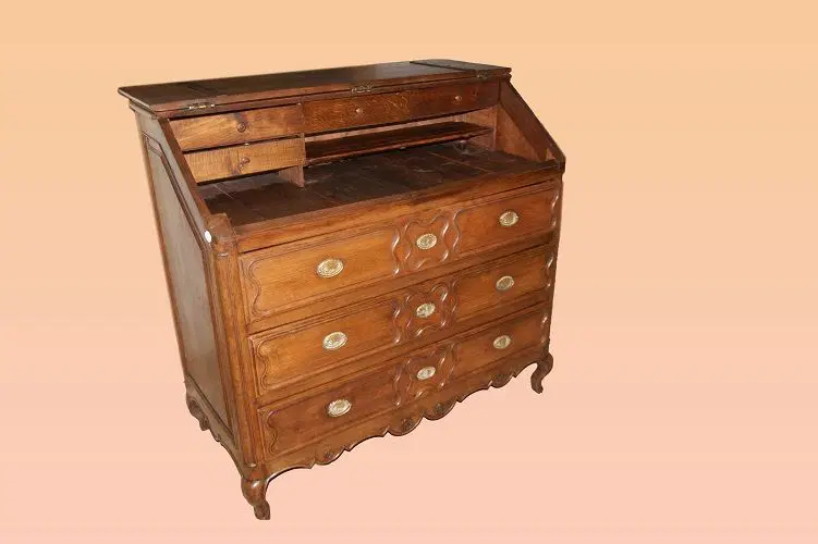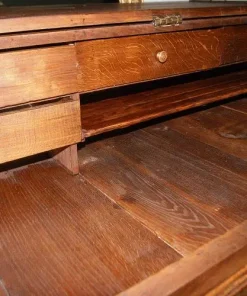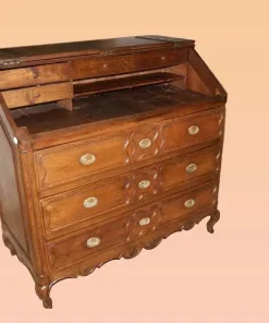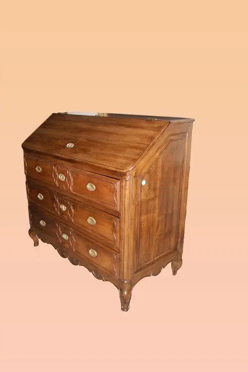 Ribalta francese della seconda metà del 1700 in legno di rovere, con maniglie in ottone con sugli sfondi raffigurato pescatore seduto su rocce in riva ad un fiume e motivi di intaglio sul fronte. Composto da 3 grandi cassetti e ribalta, la quale all’interno presenta piccoli cassetti e vano a giorno.