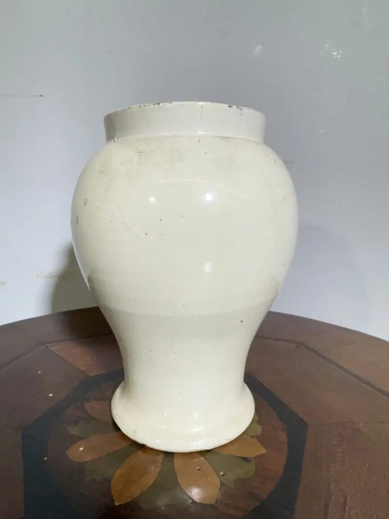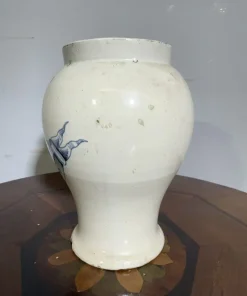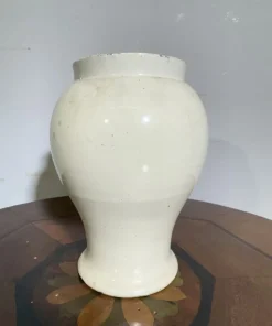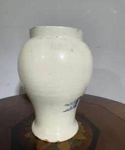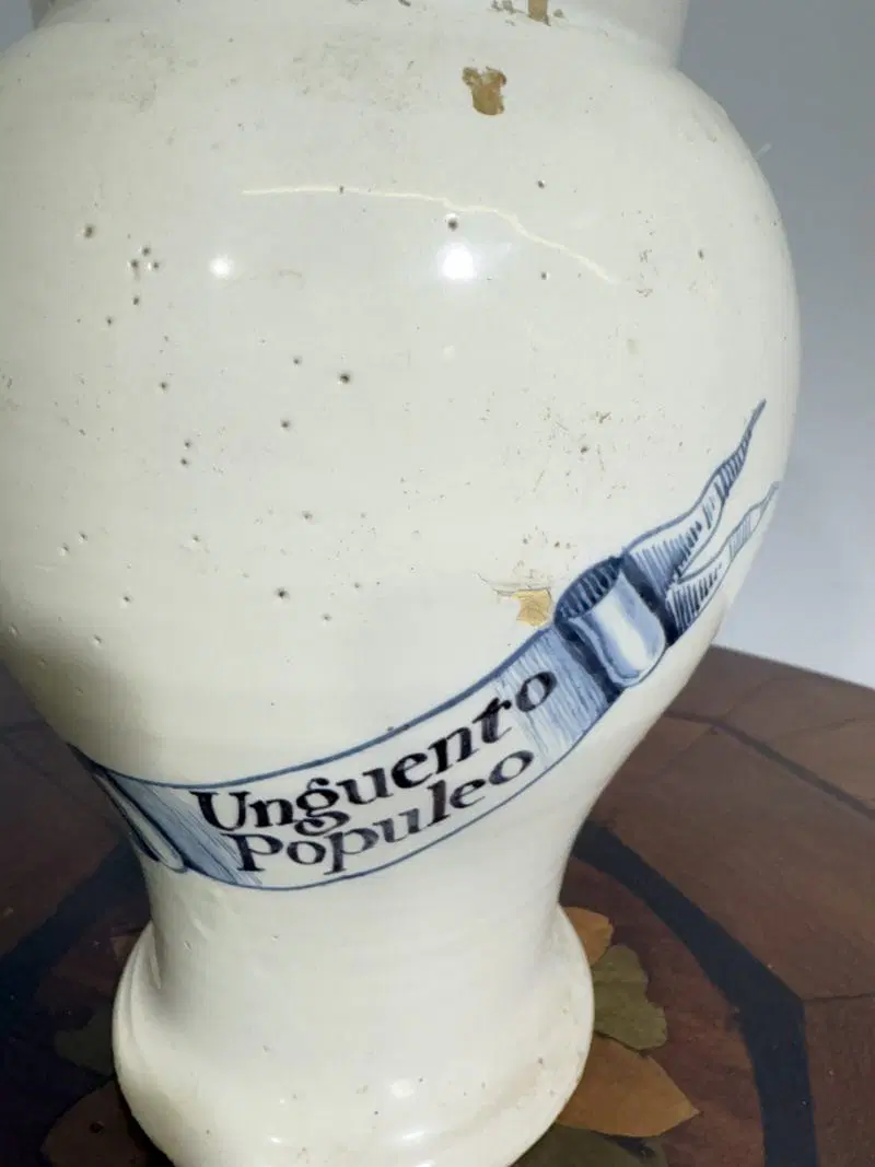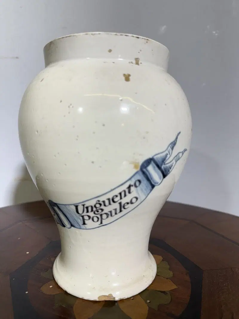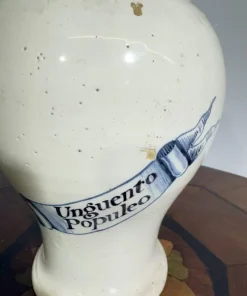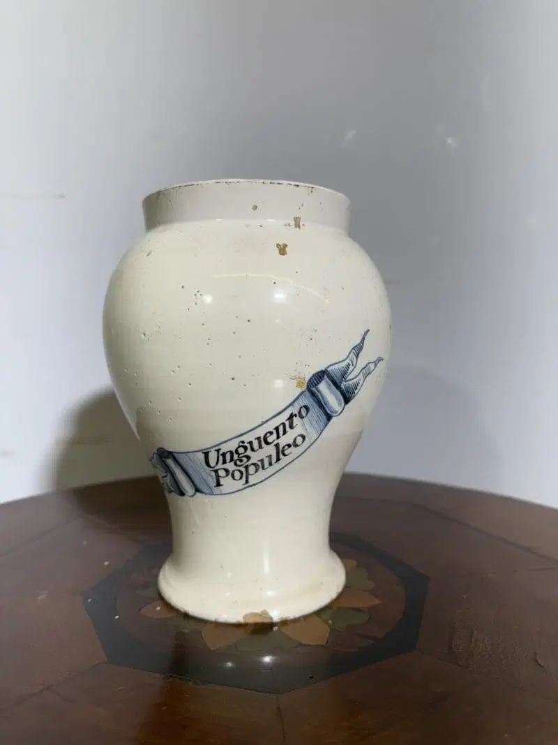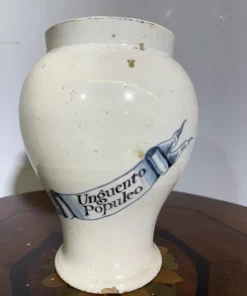Antico vaso chiamato Albarello, vaso da farmacia, epoca metà XIX. In maiolica con scritta dipinta: Unguento Populeo, h 20, lp 15 cm. Utilizzato anticamente per conservare erbe e medicinali in farmacia.