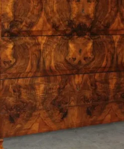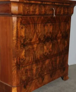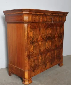 Antico bellissimo cassettone – comò L Filippo epoca 1860 in noce massello con frontale radica . Quattro cassetti , il primo sotto il piano con mossa a tulipano detta a cappuccina .Rare misure . L 105 x 46 . h 98. Restaurato !