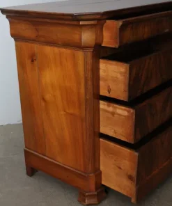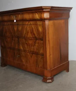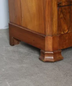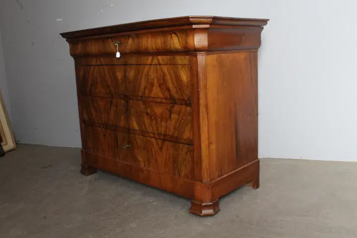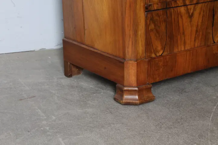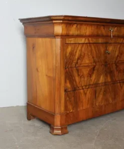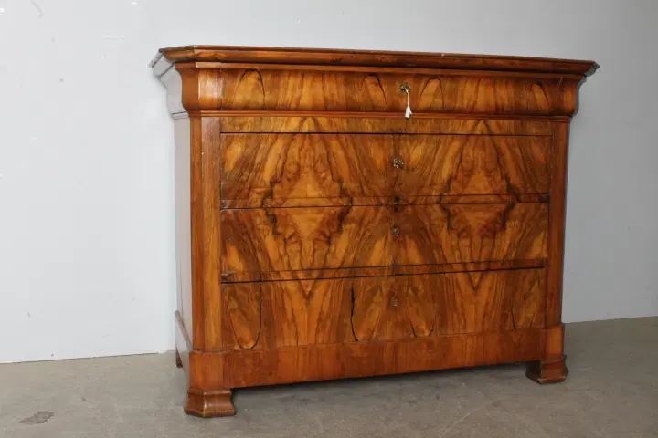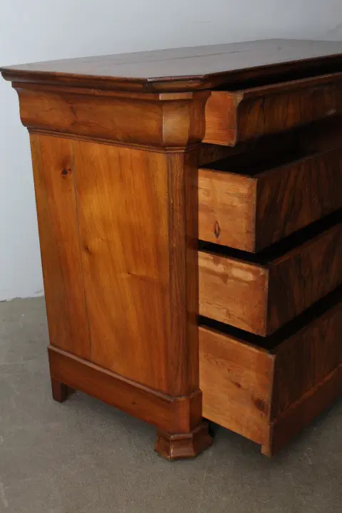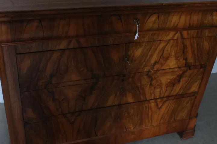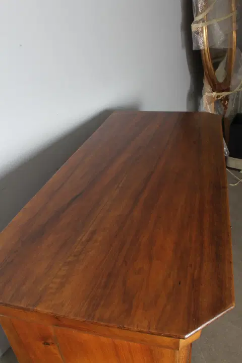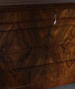 Antico cassettone in noce massello , di grande qualità , stile cappuccino .Noce biondo ,epoca 1850 – 1860 , primo cassetto svasato a forma di tulipano, cassetti frontali in radica che formano disegno. Interni dei cassetti e schiena in rovere massello. Serrature coeve. Restaurato con finitura a cera . Pronto da inserire in ambiente. Mis 128 x 56 . Altezza cm97