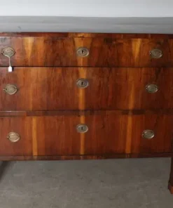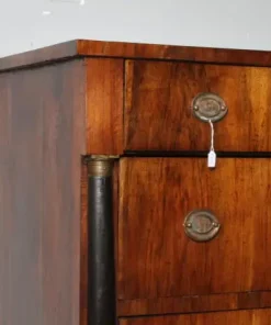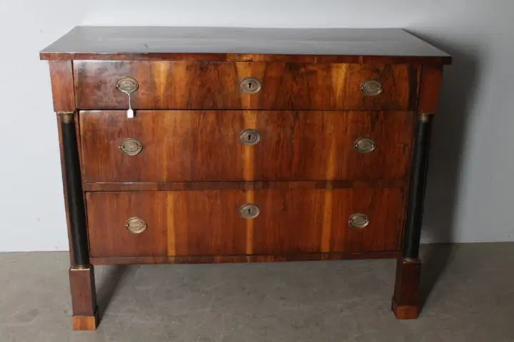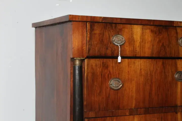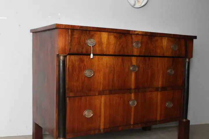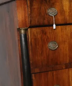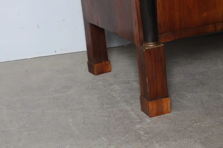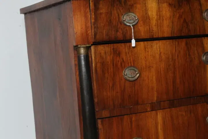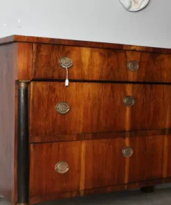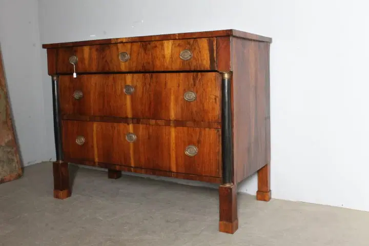 Antico comò cassettone impero XIX sec primi 800 Bologna. Noce massello con cassetti placcati in noce . Mezze colonne ebanizzate nere con bronzi . Serrature e ferramenta coeve come ogni sua parte. Restaurato mantenendo la sua patina. Finitura a cera d’ api . . Due cassetti e ½ Pronto da inserire in ambiente Mis
