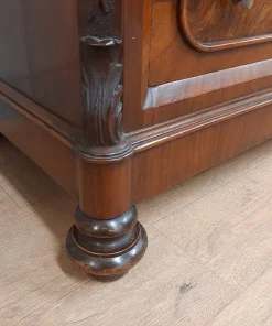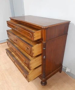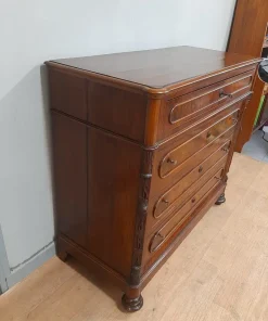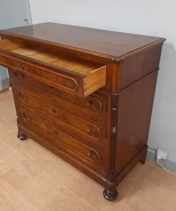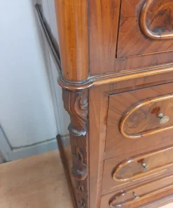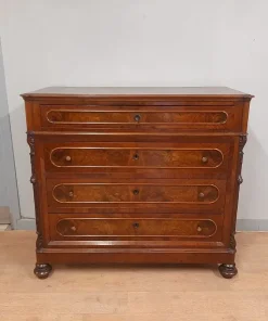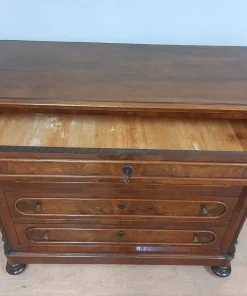NOTE: Antico comò Luigi Filippo, originale del 1870-80 circa , costruito in pioppo con incastri a coda di rondine e rivestito in noce e radica sul fronte.