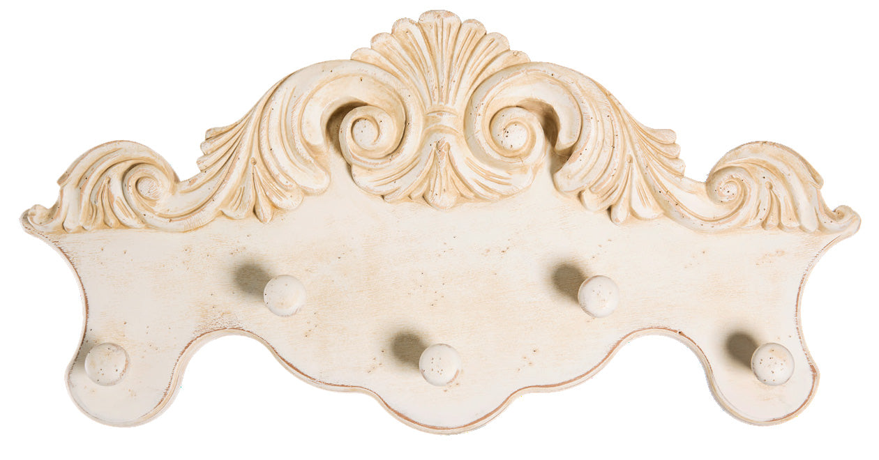 Elegante appendiabiti da parete grazie al design classico con ricca decorazione intagliata con foglie che lo inquadra. Prodotto in legno sagomato, questo appendino comprende 5 ganci in legno e sarà utile posizionato nell’ingresso.