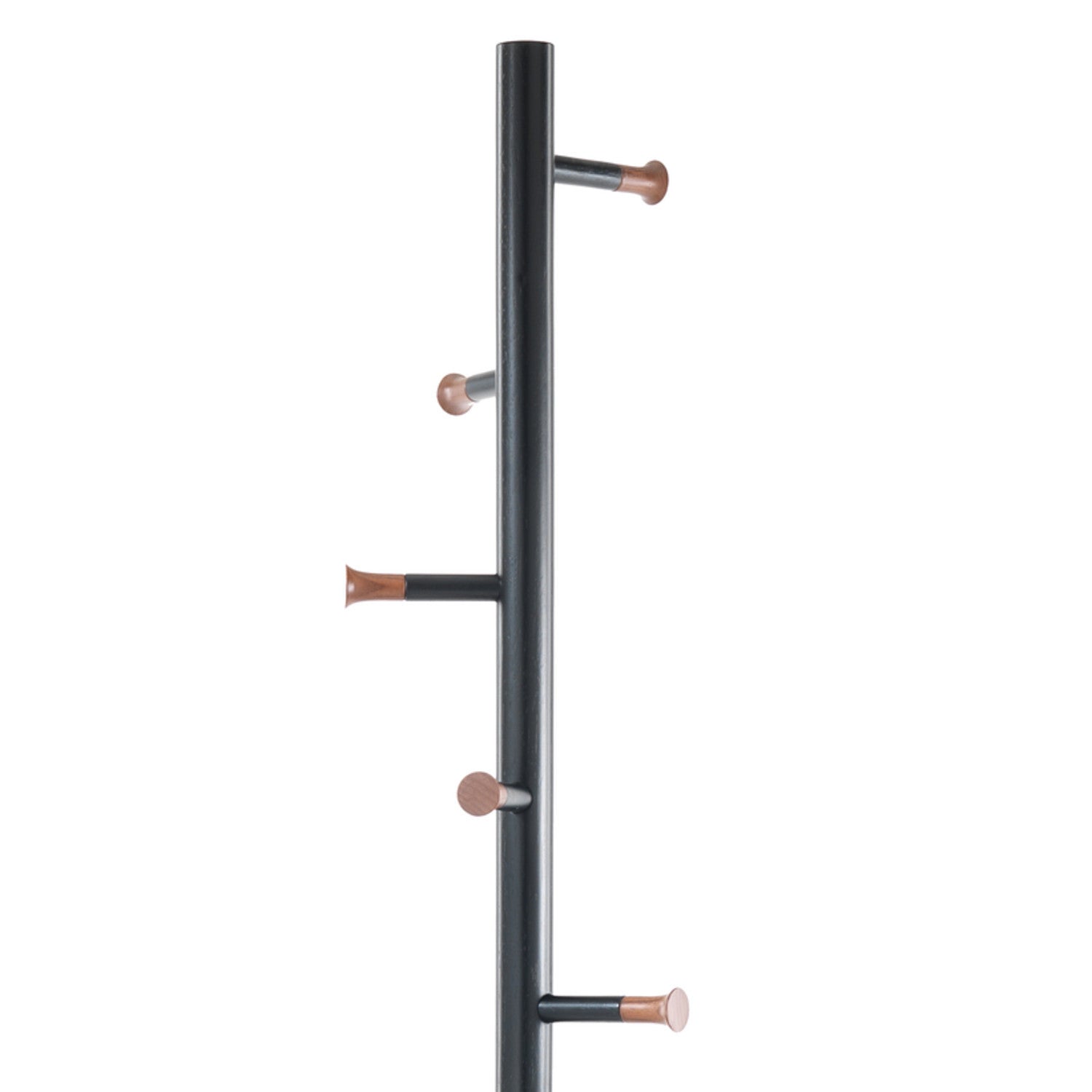 Moderno appendiabiti da terra composto da una base in metallo e da un’asta composta da 5 pomelli in legno. La composizione si presenta con un design moderno e semplice, dove la base in metallo e l’asta in legno massello sono verniciate con un colore nero opaco mentre i 5 pomelli vedono una finitura naturale noce che si distingue dalla composizione e mette in risalto tutta la bellezza di questo elemento ed il suo stile che lo caratterizza.