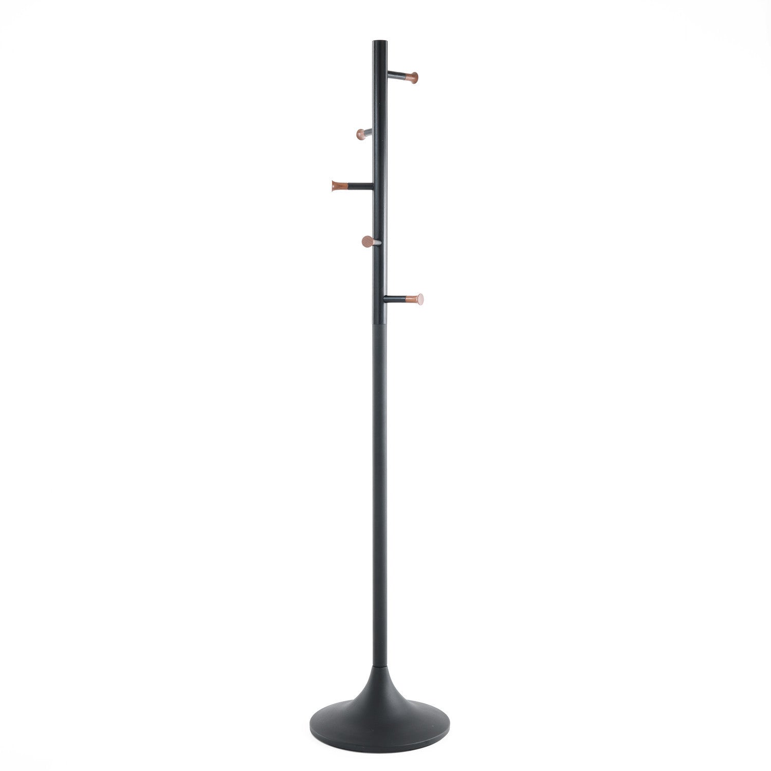 Appendiabiti da terra moderno in legno e metallo. La struttura si presenta con un design semplice e moderno ed è composto da una base in metallo ed una struttura, compresa di 5 pomelli, in legno massello. A mettere in risalto lo stile moderno è la presenza di una forte contrapposizione di un nero opaco che colora tutta la struttura con una particolare e bellissima finitura noce applicata sui pomelli. Adattabile ad ogni ambiente, questo appendiabiti splende per la sua bellezza e la sua eleganza.