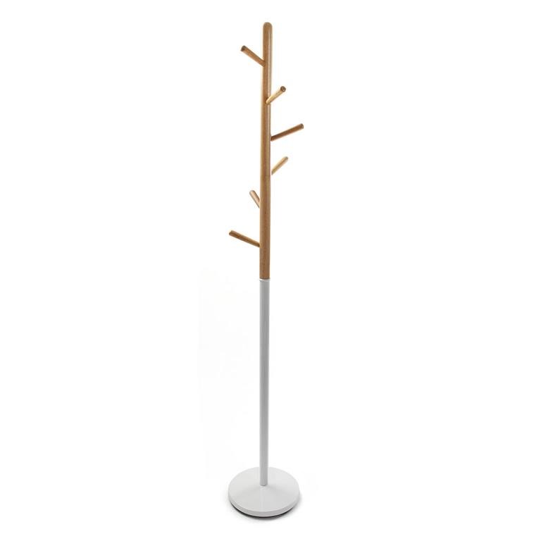 Appendiabiti da terra a forma di albero dotato di 6 appendini e realizzato in legno e metallo secondo uno stile moderno, riconoscibile dall’uso del colore bianco accostato alla finitura naturale del legno. L’appendiabiti si adatta ad ogni tipo di ambiente.