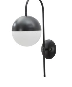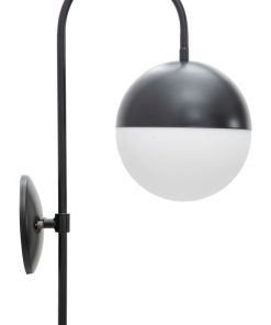 Lampada da muro una luce definita da semplici forme, con paralume a sfera e braccio in metallo, caratterizzata dall’abbinamento bianco e nero.