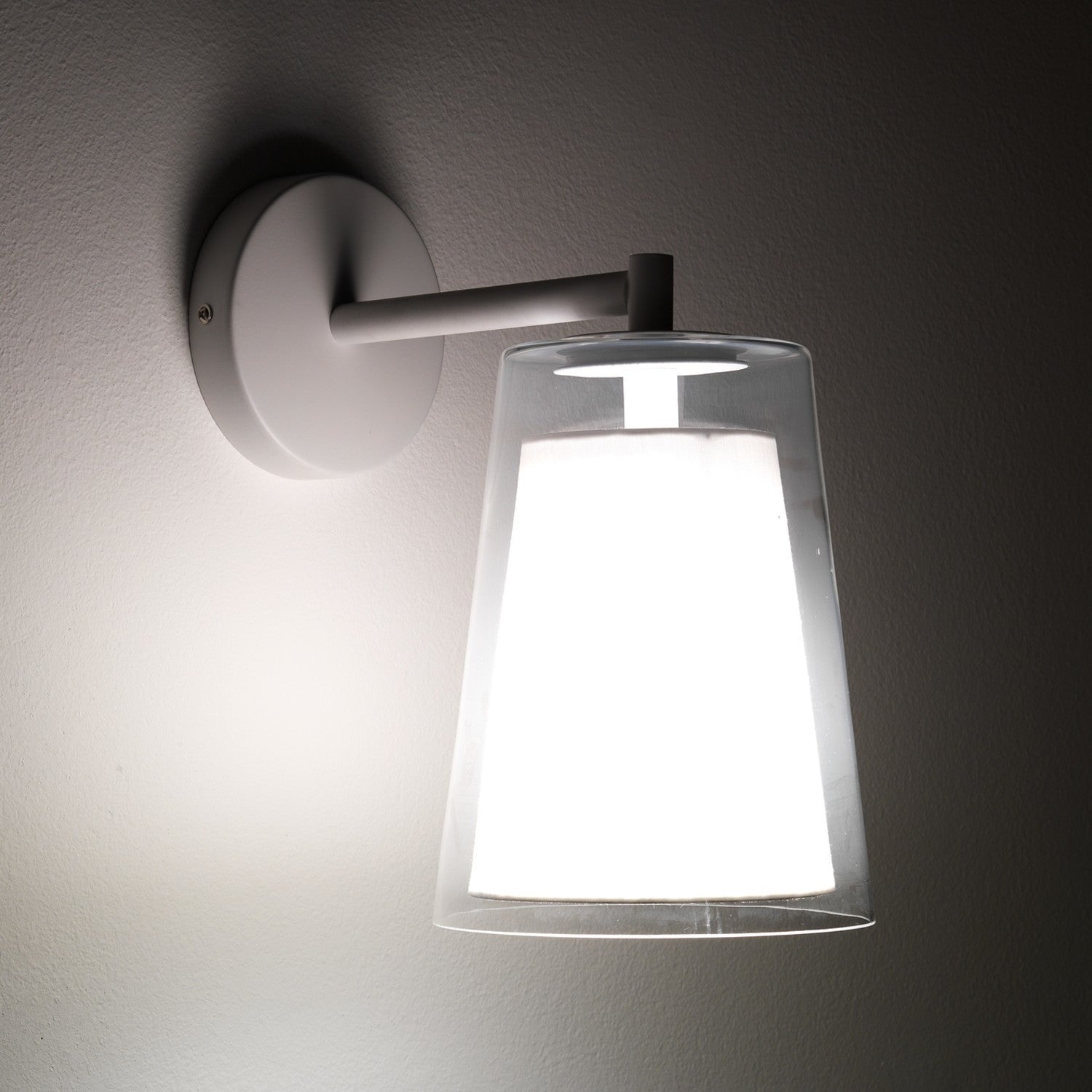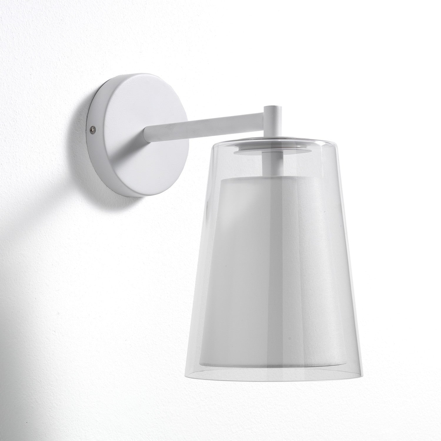 Applique da parete moderna composto da una struttura in metallo di colore bianco opaco, una predisposizione per lampadina e due paralumi differenti, uno interno in tessuto di colore bianco ed uno esterno in vetro trasparente. Il design di questa applique è semplice e lineare, e sono dettagli come il doppio paralume a rendere questo elemento molto moderno.
