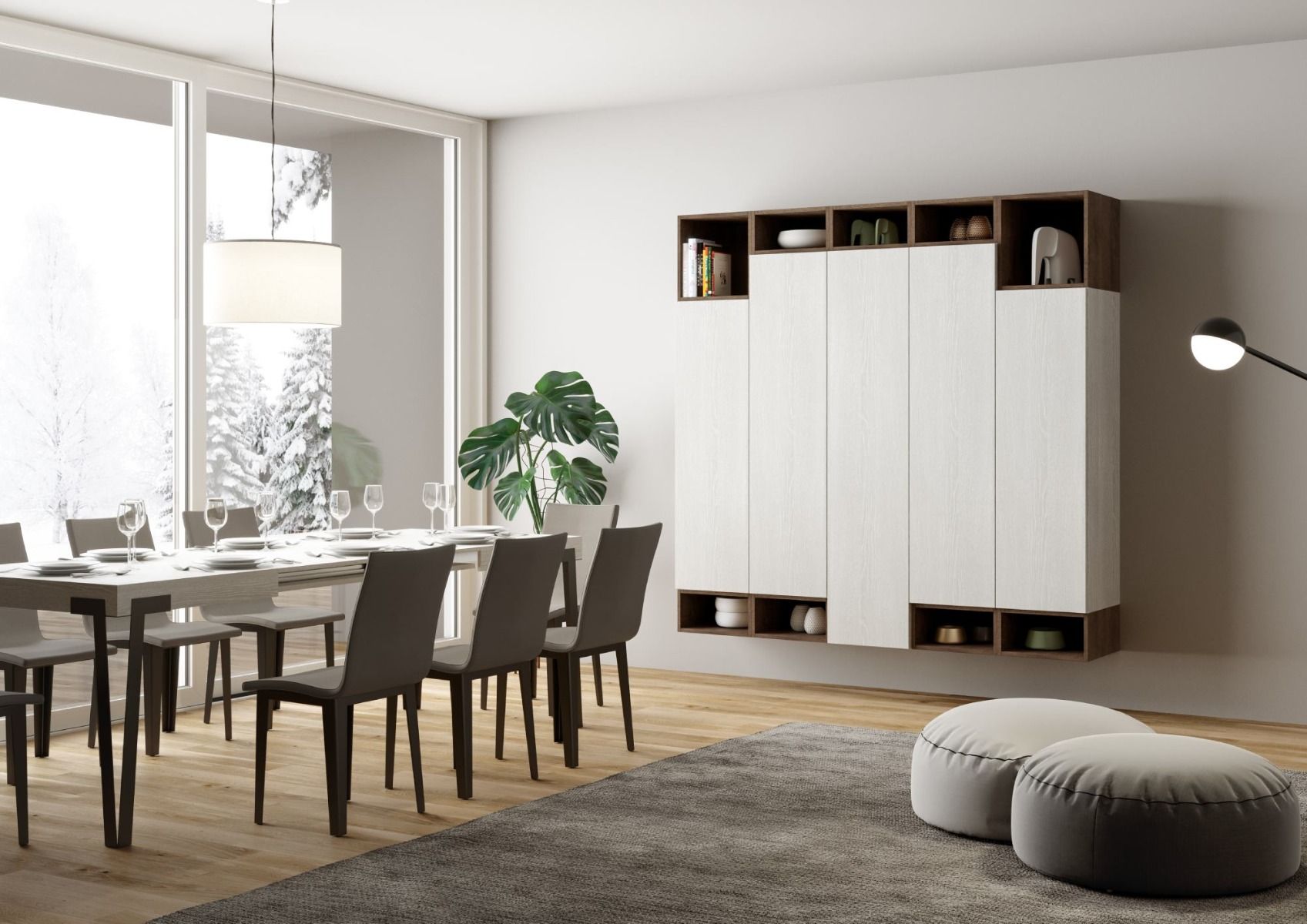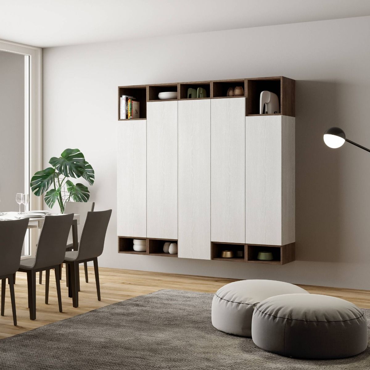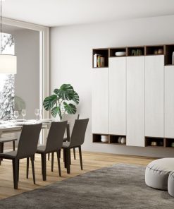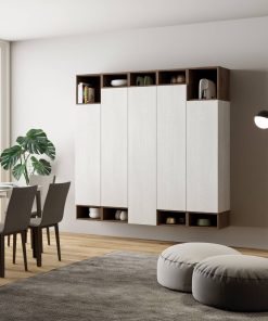 Aristea – Parete design per living o ingresso in legno bianco e noce