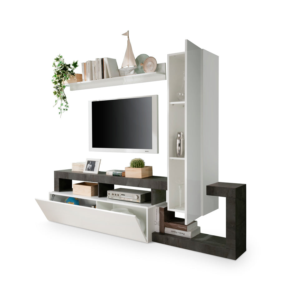 Aristide presenta una base porta tv con vani a giornom una mensola e un spazioso pensile verticale.