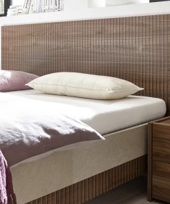 Fantastico letto matrimoniale realizzato in legno con testiera serigrafata raffigurante una trama con linee verticali, motivo ripreso nella parte inferiore del giroletto, mentre il resto è realizzato in finitura argilla. Il letto moderno Arkona è ideale per chi ama la calda finitura del legno colore noce con la ricchezza di un design serigrafato che rende il letto ancora più contemporaneo. Arkona è disponibile anche nella versione con solo rete oppure rete con contenitore.
