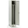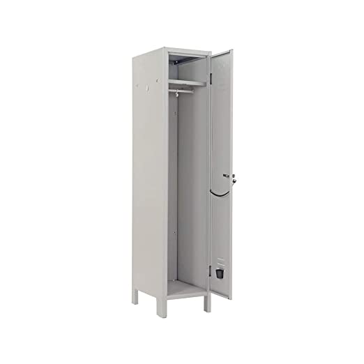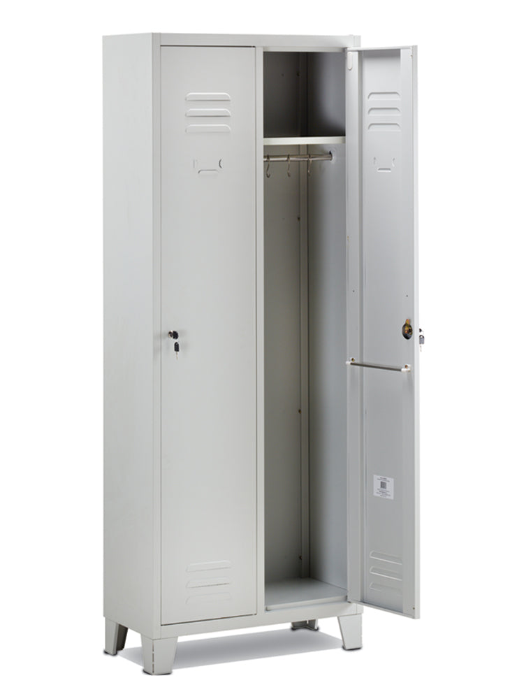 Armadietto da lavoro in metallo dotato di anta apribile che da accesso ad un piano di appoggio nella parte superiore e ad un’asta che permette di appendere abiti puliti e abiti sporchi. L’armadietto è disponibile sia nella versione ad un solo posto, sia nella versione a due posti.