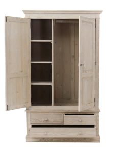 Armadio 2 ante con 3 cassetti, asta appendiabiti e ripiani interni, il guardaroba perfetto per la tua camera da letto dall’arredamento country e rustico. Questo armadio vanta una massiccia struttura realizzata in legno massello di abete naturale, un mobile di pregio anche per una lavorazione particolareggiata che disegna uno stile puramente classico.