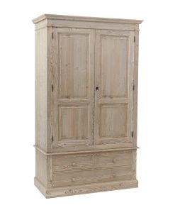 Armadio 2 ante con 3 cassetti, asta appendiabiti e ripiani interni, il guardaroba perfetto per la tua camera da letto dall’arredamento country e rustico. Questo armadio vanta una massiccia struttura realizzata in legno massello di abete naturale, un mobile di pregio anche per una lavorazione particolareggiata che disegna uno stile puramente classico.