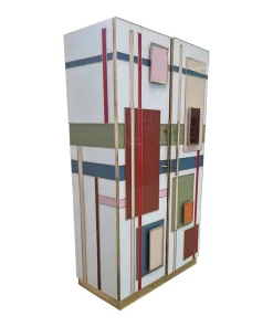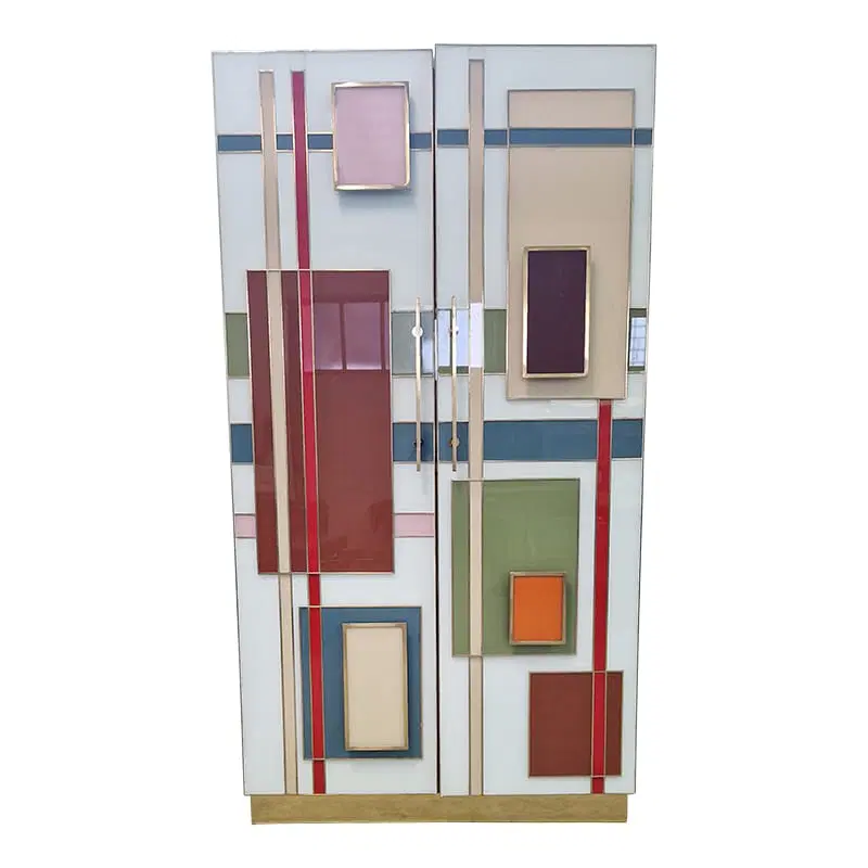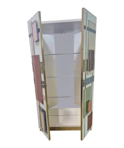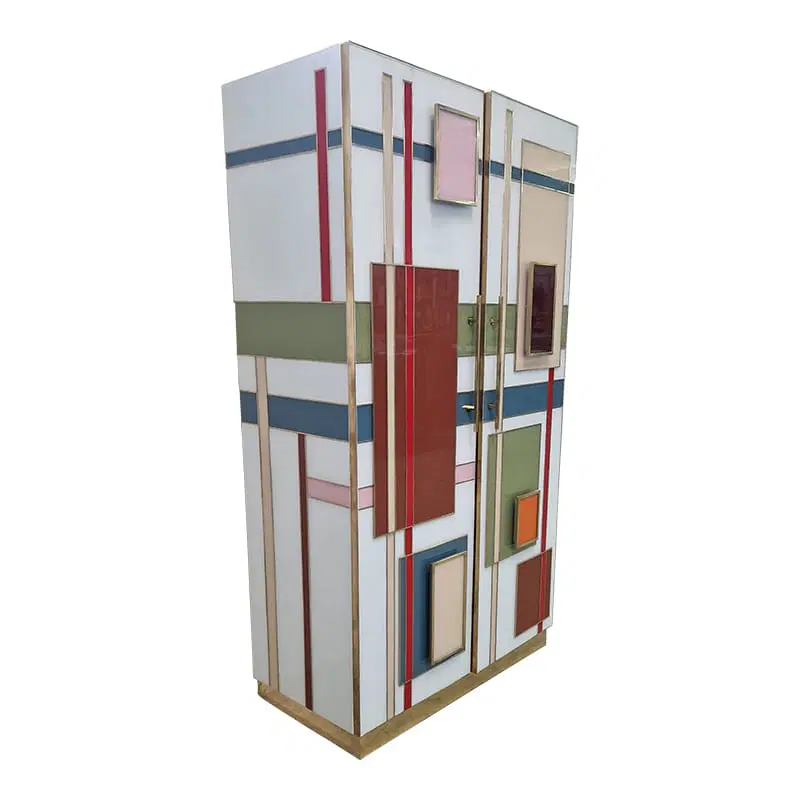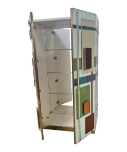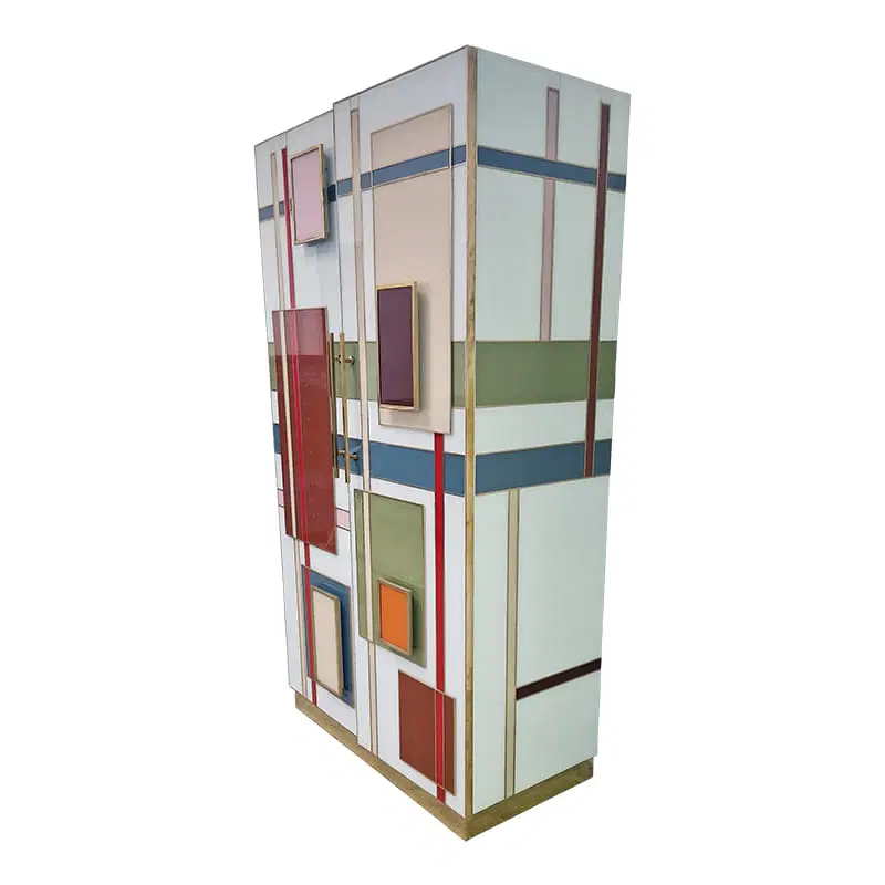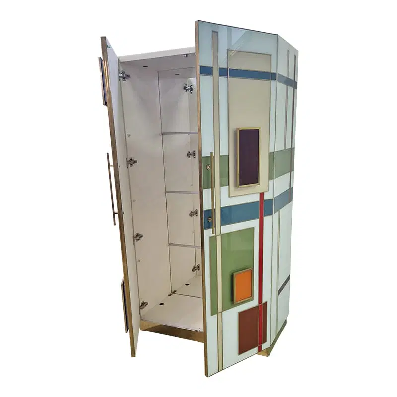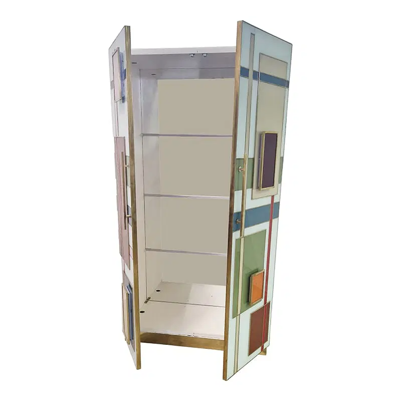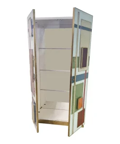 Armadio dispensa con ripiani interni, interamente realizzata a mano, con struttura in legno rivestita in vetro color pastello. Profili e piedi in ottone dorato. Le maniglie sono retroilluminate con strisce a led.