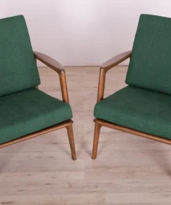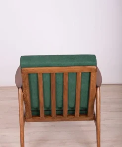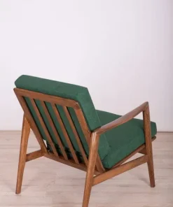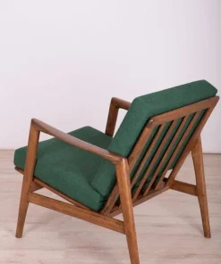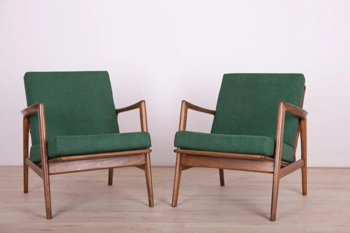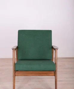 This pair of armchairs was produced by the Polish company Swarzędzka. Furniture Factory. The armchairs have been reupholstered in a green material and the beech elements have been cleaned and polished with a lacquer.