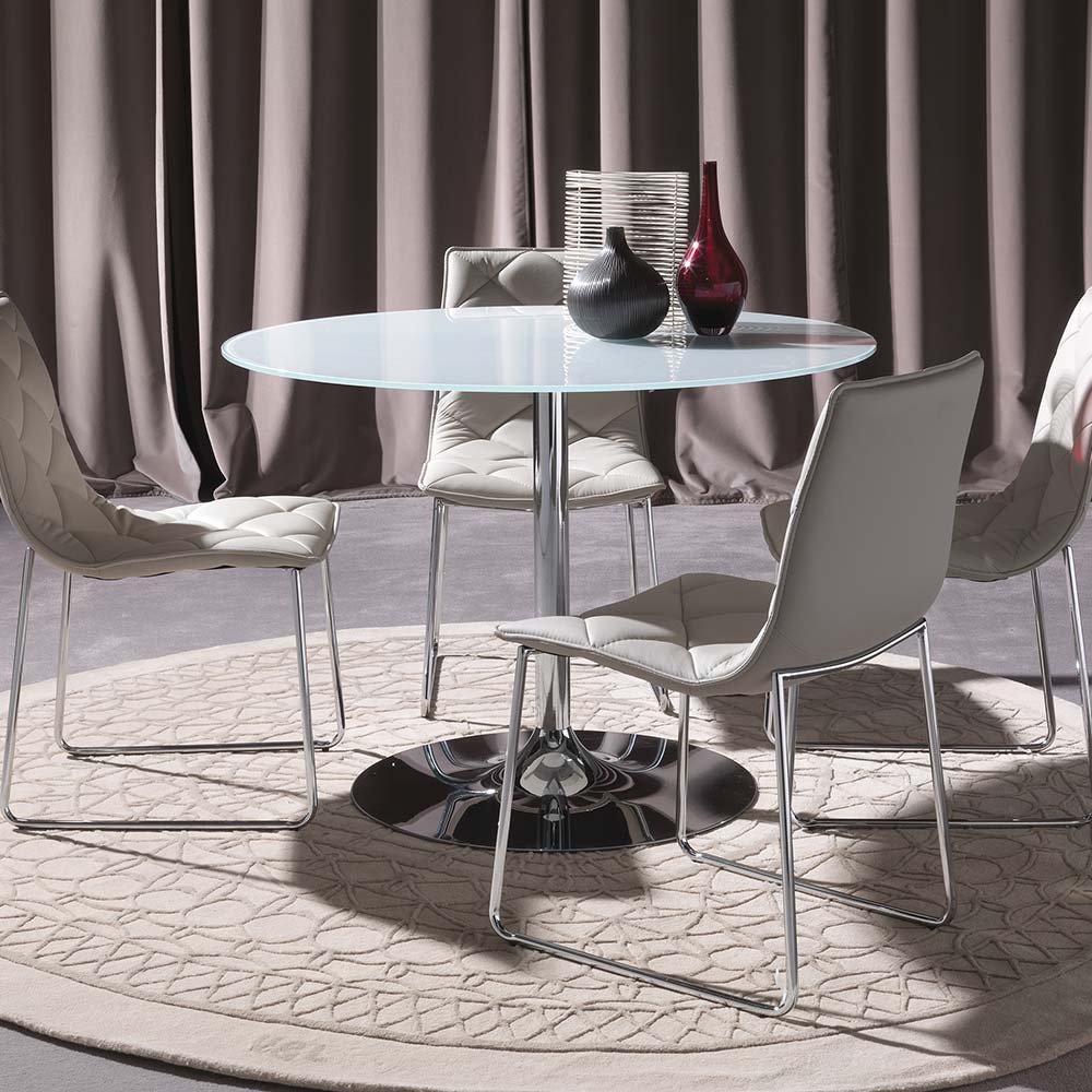 Stupendo tavolo tondo modello Armony, il modello giusto che coniuga l’esigenza di un tavolo non troppo ingombrante con l’eleganza del vetro. Infatti, il tavolo moderno Armony presenta un finissimo piano in vetro extrawhite con base a gamba centrale realizzata in metallo cromato, ampia e solida per assicurare stabilità.
