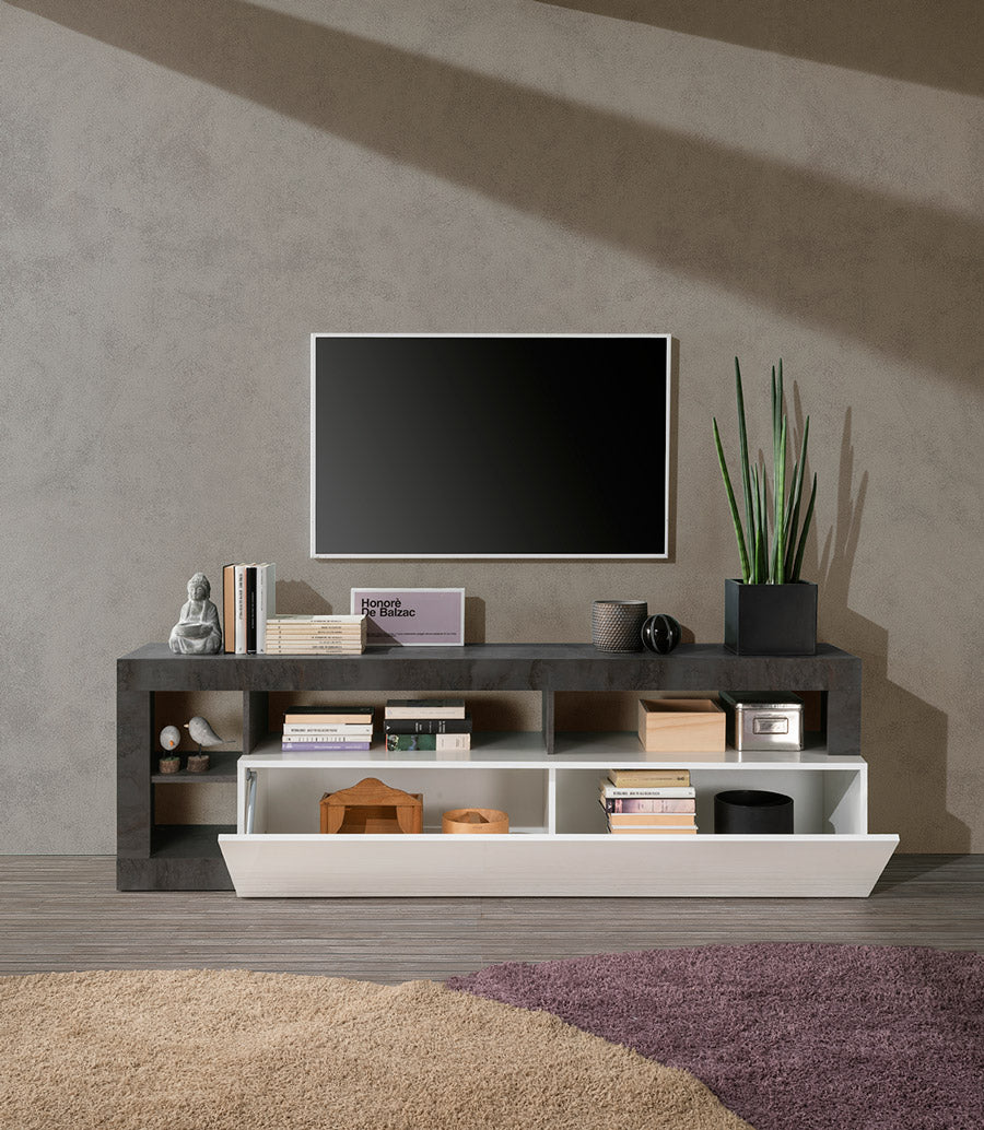 Aronne è un pratico mobile porta tv facente parte di una bellissima linea di mobili living dallo stile moderno e intrigante. La produzione Made in Italy si orienta a soluzioni sempre più funzionali con un design distinto come il nostro mobile tv, caratterizzato da un semplice base squadrata bianco lucido con anta a ribalta circondato da una struttura dal colore ossido o pero divisa in 4 vani aperti.