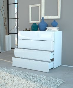Cassettiera in legno, colore bianco lucido laccato, con 4 cassettoni contenitore. Realizzata con eleganza, questa cassettiera è perfetta da collocare in soggiorno o sala da pranzo, offrendo un look moderno e raffinato, design caratterizzato dalle forme ondulate dei cassetti, il quale dona semplicità e stravaganza contemporaneamente.